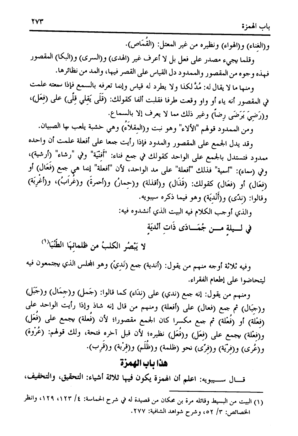 وقد يدل الجمع على المقصور والمدود فإذا رأيت جمعا على أفعلة علمت أن واحده ممدود فتستدل بالجمع على الواحد كقولك في جمع فناء: " أفنية " وفي " رشاء " (أرشية)، وفي (سماء): " أسمية " فذلك " أفعلة " على مد الواحد، لأن " أفعلة " إنما هي جمع (فعال) أو (فعال) أو (فعال) كقولك: (قذال) و (أقذلة) و (حمار) و (أحمرة) و (غراب)، و (أغربة) وقالوا: (ندى) و (أندية) وهو فيما ذكره سيبويه.
