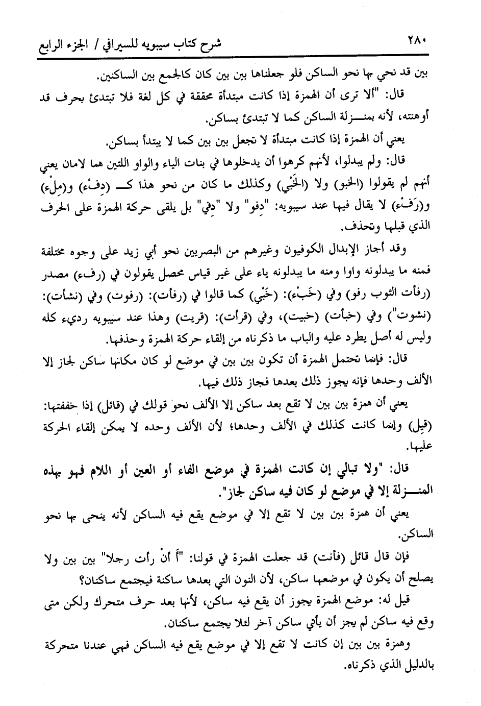 قال: ولم يبدلوا، لأنهم كرهوا أن يدخلوها في بنات الياء والواو اللتين هما لامان يعني أنهم لم يقولوا (الخبو) ولا (الخبي) وكذلك ما كان من نحو هذا ك (دفء) و (ملء) و (رفء) لا يقال فيها عند سيبويه: " دفو " ولا " دفي " بل يلقى حركة الهمزة على الحرف الذي قبلها وتحذف.
