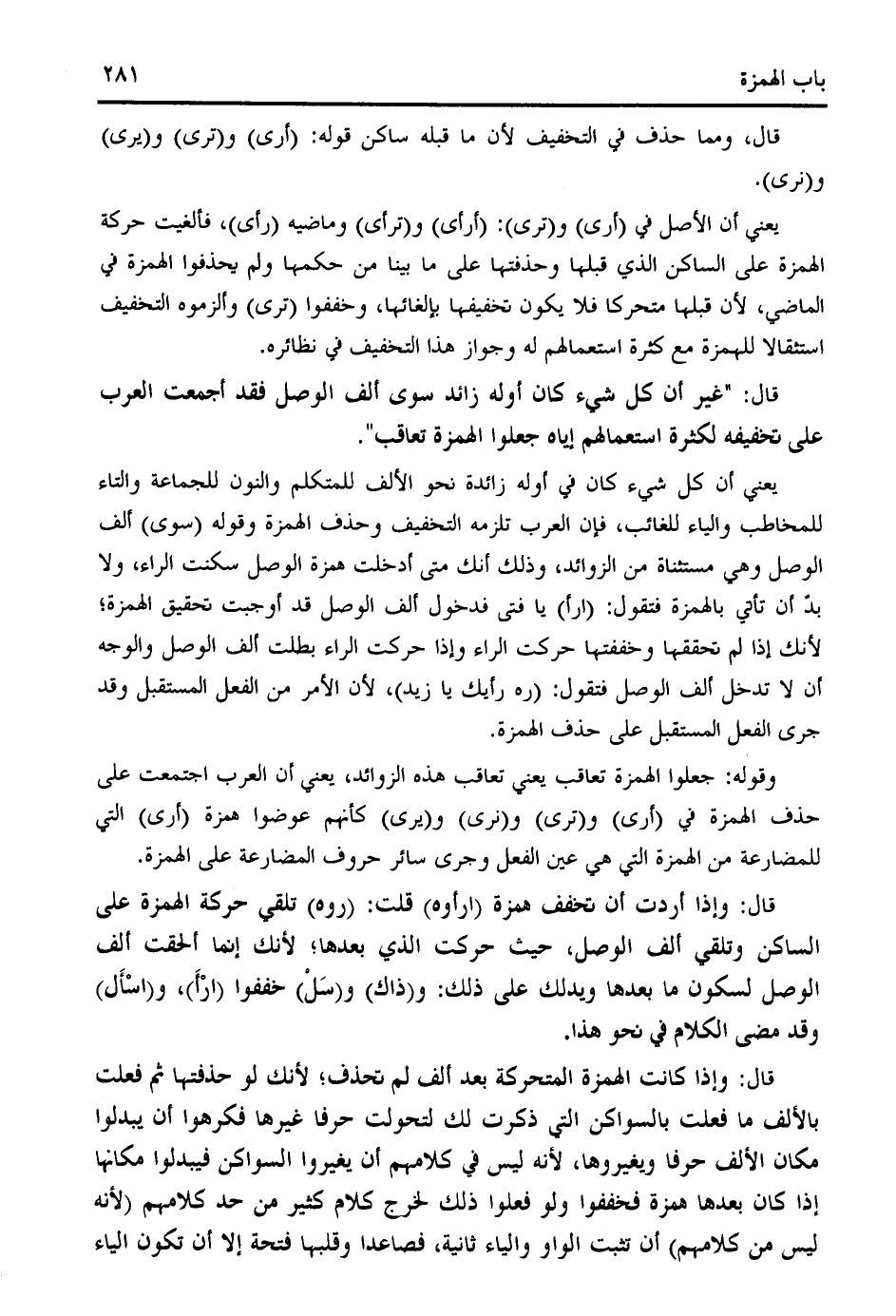 يعني أن الأصل في (أرى) و (ترى): (أرأى) و (ترأى) وماضيه (رأى)، فألغيت حركة الهمزة على الساكن الذي قبلها وحذفتها على ما بينا من حكمها ولم يحذفوا الهمزة في الماضي، لأن قبلها متحركا فلا يكون تخفيفها بإلغائها، وخففوا (ترى) وألزموه التخفيف استثقالا للهمزة مع كثرة استعمالهم له وجواز هذا التخفيف في نظائره.