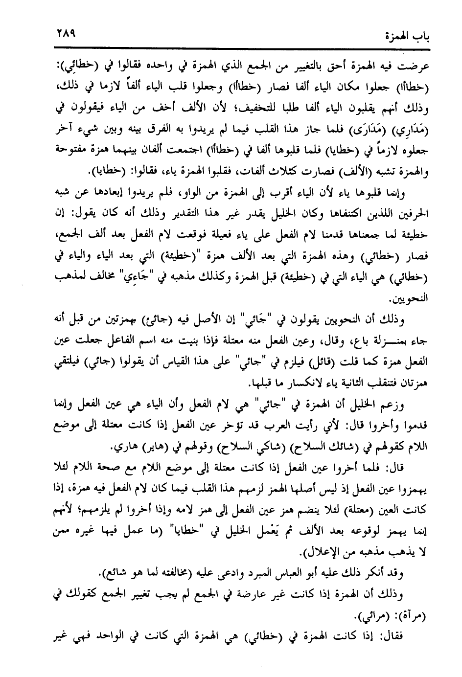 قال: فلما أخروا عين الفعل إذا كانت معتلة إلى موضع اللام مع صحة اللام لئلا يهمزوا عين الفعل إذ ليس أصلها الهمز لزمهم هذا القلب فيما كان لام الفعل فيه همزة، إذا كانت العين (معتلة) لئلا ينضم همز عين الفعل إلى همز لامه وإذا أخروا لم يلزمهم؛ لأنهم إنما يهمز لوقوعه بعد الألف ثم يعمل الخليل في " خطايا " (ما عمل فيها غيره ممن لا يذهب مذهبه من الإعلال).