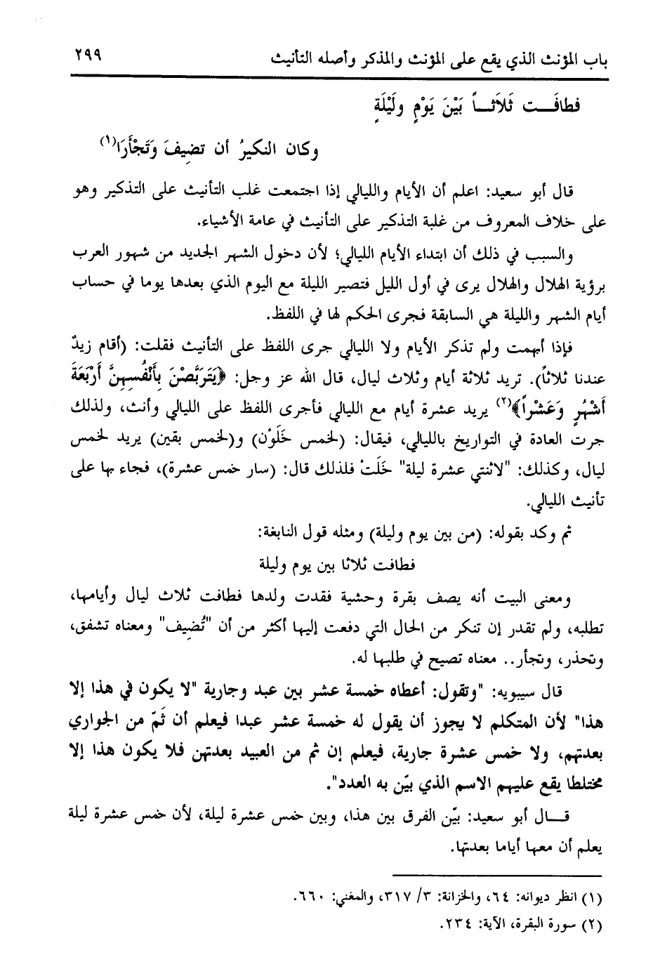 قال أبو سعيد: اعلم أن الأيام والليالي إذا اجتمعت غلب التأنيث على التذكير وهو على خلاف المعروف من غلبة التذكير على التأنيث في عامة الأشياء.