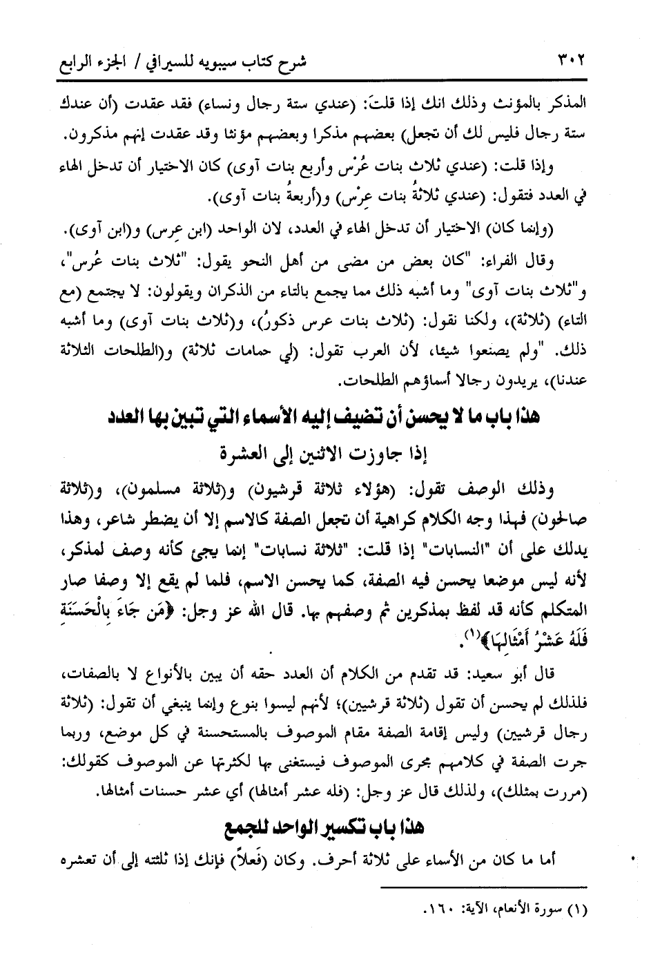 وذلك الوصف تقول: (هؤلاء ثلاثة قرشيون) و (ثلاثة مسلمون)، و (ثلاثة صالحون) فهذا وجه الكلام كراهية أن تجعل الصفة كالاسم إلا أن يضطر شاعر، وهذا يدلك على أن " النسابات " إذا قلت: " ثلاثة نسابات " إنما يجئ كأنه وصف لمذكر، لأنه ليس موضعا يحسن فيه الصفة، كما يحسن الاسم، فلما لم يقع إلا وصفا صار المتكلم كأنه قد لفظ بمذكرين ثم وصفهم بها. قال الله عز وجل: مَنْ جاءَ بِالْحَسَنَةِ فَلَهُ عَشْرُ أَمْثالِها (¬1).