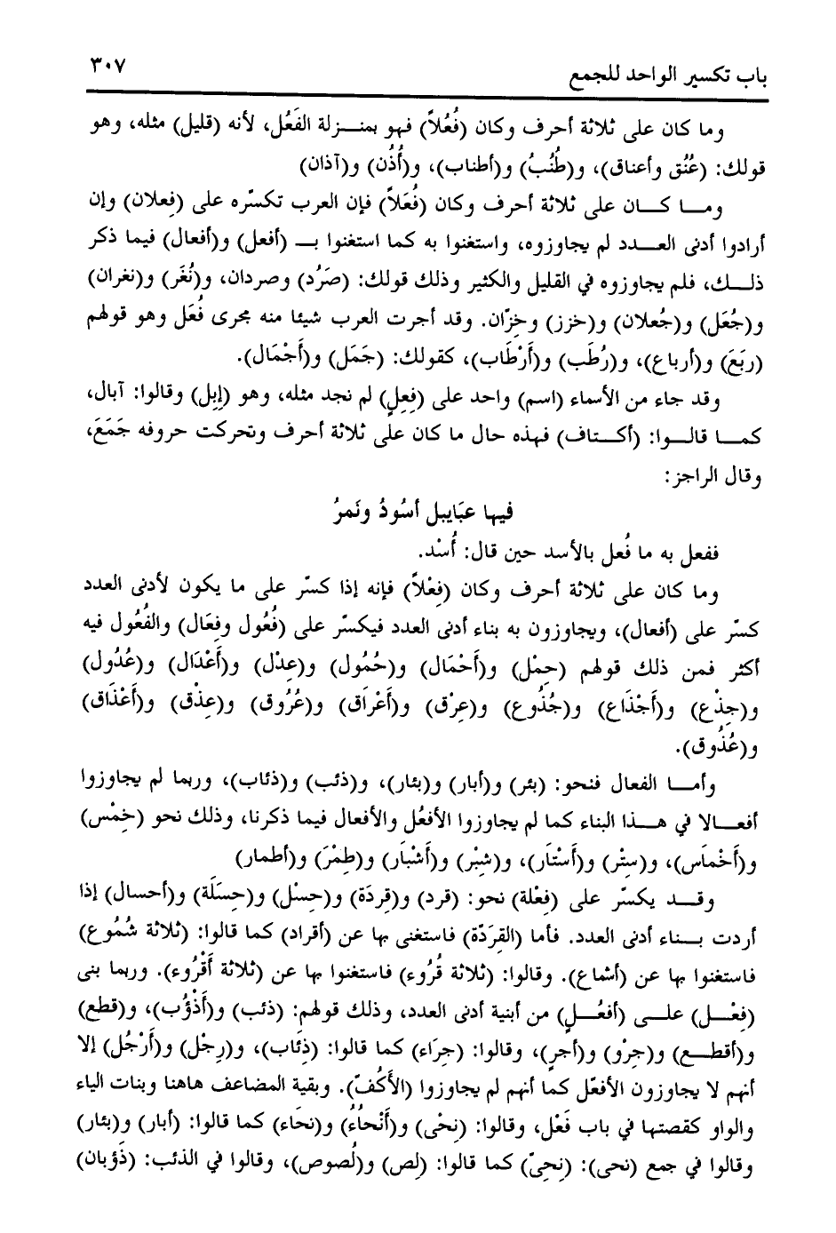 وقد جاء من الأسماء (اسم) واحد على (فعل) لم نجد مثله، وهو (إبل) وقالوا: آبال، كما قالوا: (أكتاف) فهذه حال ما كان على ثلاثة أحرف وتحركت حروفه جمع، وقال الراجز: