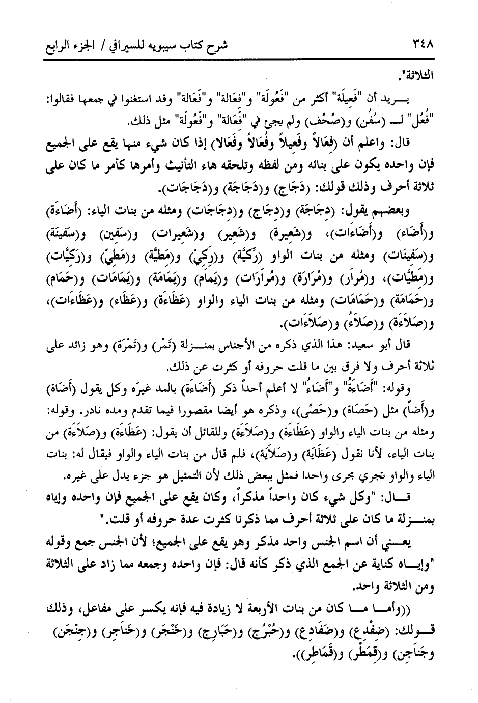 ((وأما ما كان من بنات الأربعة لا زيادة فيه فإنه يكسر على مفاعل، وذلك قولك: (ضفدع) و (ضفادع) و (حبرج) و (حبارج) و (خنجر) و (خناجر) و (جنجن) وجناجن) و (قمطر) و (قماطر)).