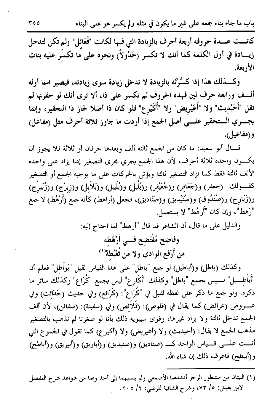 قال أبو سعيد: ما كان من الجمع ثالثه ألف وبعدها حرفان أو ثلاثة فلا يجوز أن يكون واحده ثلاثة أحرف، لأن هذا الجمع يجري مجرى التصغير إنما يزاد على واحده الألف ثالثة فقط كما تزاد التصغير ثالثة ويؤتى بالحركات على ما يوجبه الجمع أو التصغير كقولك (جعفر) و (جعافر) و (جعيفر) و (بلبل) و (بليبل) و (بلابل) و (زبرج) و (زبيرج) و (زبارج) و (صندوق) و (صنيديق) و (صناديق)، فجعل (أراهط) كأنه جمع (أرهط) لا جمع " رهط "، وإن كان " أرهط " لا يستعمل.