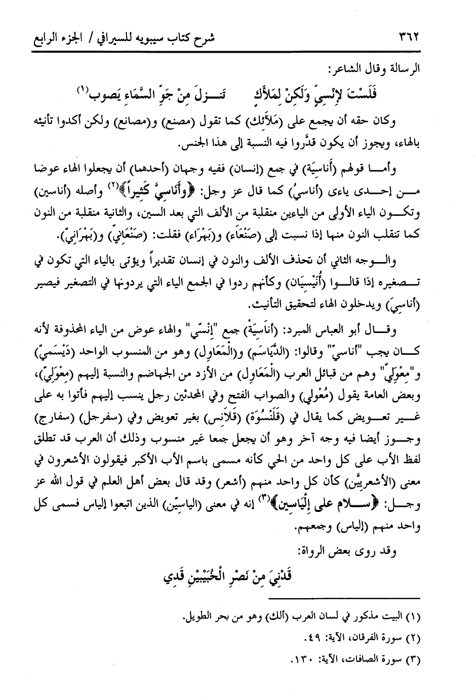 وقال أبو العباس المبرد: (أناسية) جمع " إنسّي " والهاء عوض من الياء المحذوفة لأنه كان يجب " أناسيّ " وقالوا: (الدّياسم) و (المعاول) وهو من المنسوب الواحد (ديسميّ) و " معوليّ " وهم من قبائل العرب (المعاول) من الأزد من الجهاضم والنسبة إليهم (معوليّ)، وبعض العامة يقول (معولي) والصواب الفتح وفي المحدثين رجل ينسب إليهم فأتوا به على غير تعويض كما يقال في (قلنسوة) (قلانس) بغير تعويض وفي (سفرجل) (سفارج) وجوز أيضا فيه وجه آخر وهو أن يجعل جمعا غير منسوب وذلك أن العرب قد تطلق لفظ الأب على كل واحد من الحي كأنه مسمى باسم الأب الأكبر فيقولون الأشعرون في معنى (الأشعريّين) كأن كل واحد منهم (أشعر) وقد قال بعض أهل العلم في قول الله عز وجل: سَلامٌ عَلى إِلْ ياسِينَ (¬3) إنه في معنى (ال ياسيّن) الذين اتبعوا إلياس فسمى كل واحد منهم (إلياس) وجمعهم.