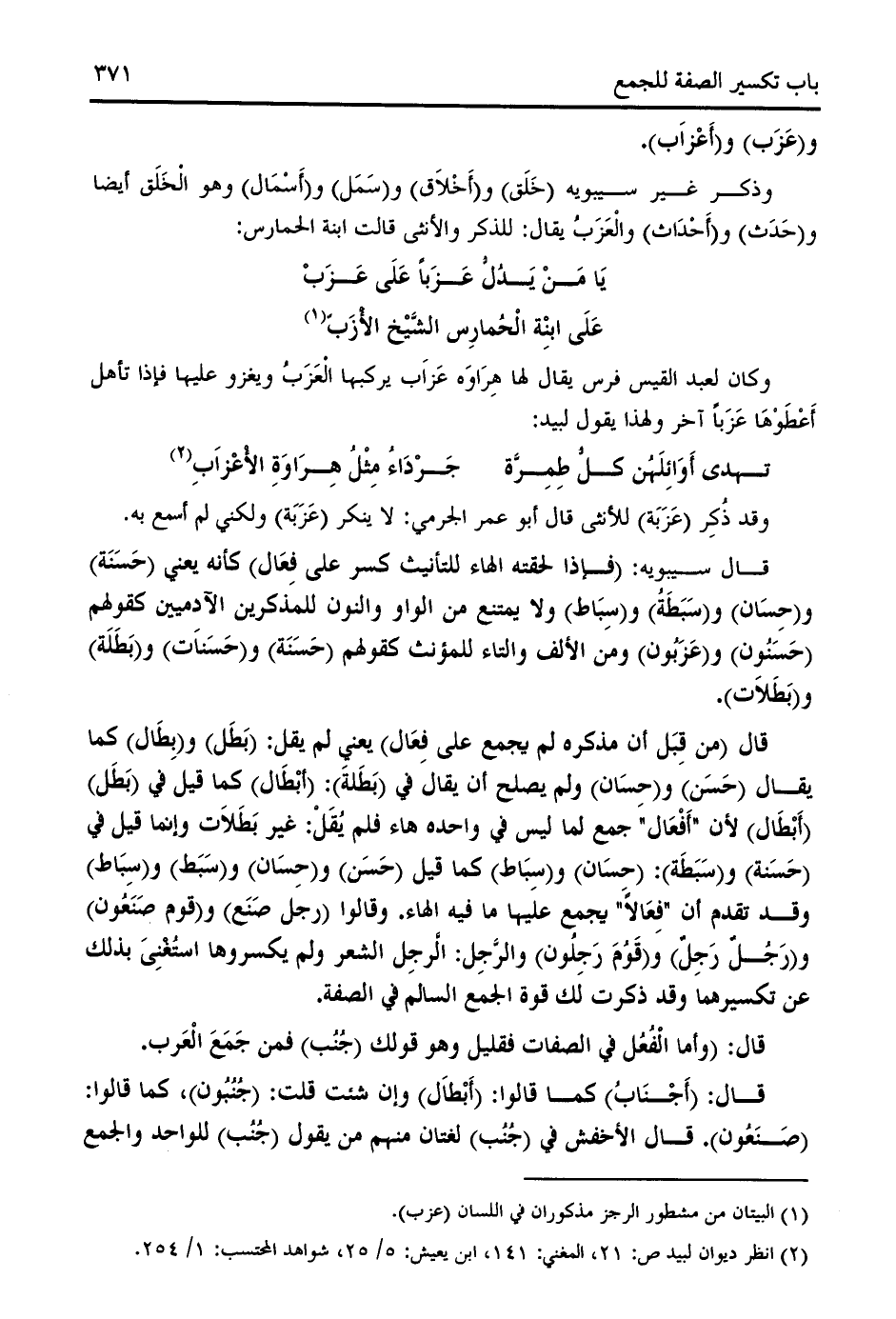 أن يقال في (بطلة): (أبطال) كما قيل في (بطل) (أبطال) لأن " أفعال " جمع لما ليس في واحده هاء فلم يقل: غير بطلات وإنما قيل في (حسنة) و (سبطة): (حسان) و (سباط) كما قيل (حسن) و (حسان) و (سبط) و (سباط) وقد تقدم أن " فعالا " يجمع عليها ما فيه الهاء. وقالوا (رجل صنع) و (قوم صنعون) و (رجل رجل) و (قوم رجلون) والرّجل: الّرجل الشعر ولم يكسروها استغنى بذلك عن تكسيرهما وقد ذكرت لك قوة الجمع السالم في الصفة.