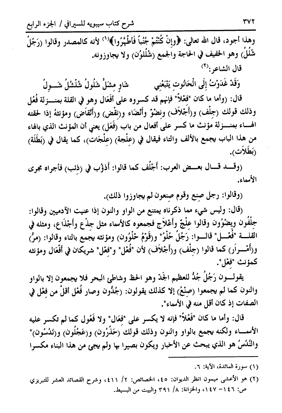 جلفون ويضوون وقالوا علج وأعلاج فجمعوه كالأسماء مثل جذع وأجذاع، ومثله في القلة " فعل " قالوا: رجل حلو " و (قوم حلوون) ومؤنثه يجمع بالتاء وقالوا: (مرّ) و (أمرار) كما قالوا (جلف) و (أجلاف) لأن " فعل " و " فعل " شريكان في أفعال ومؤنثه كمؤنث " فعل ".