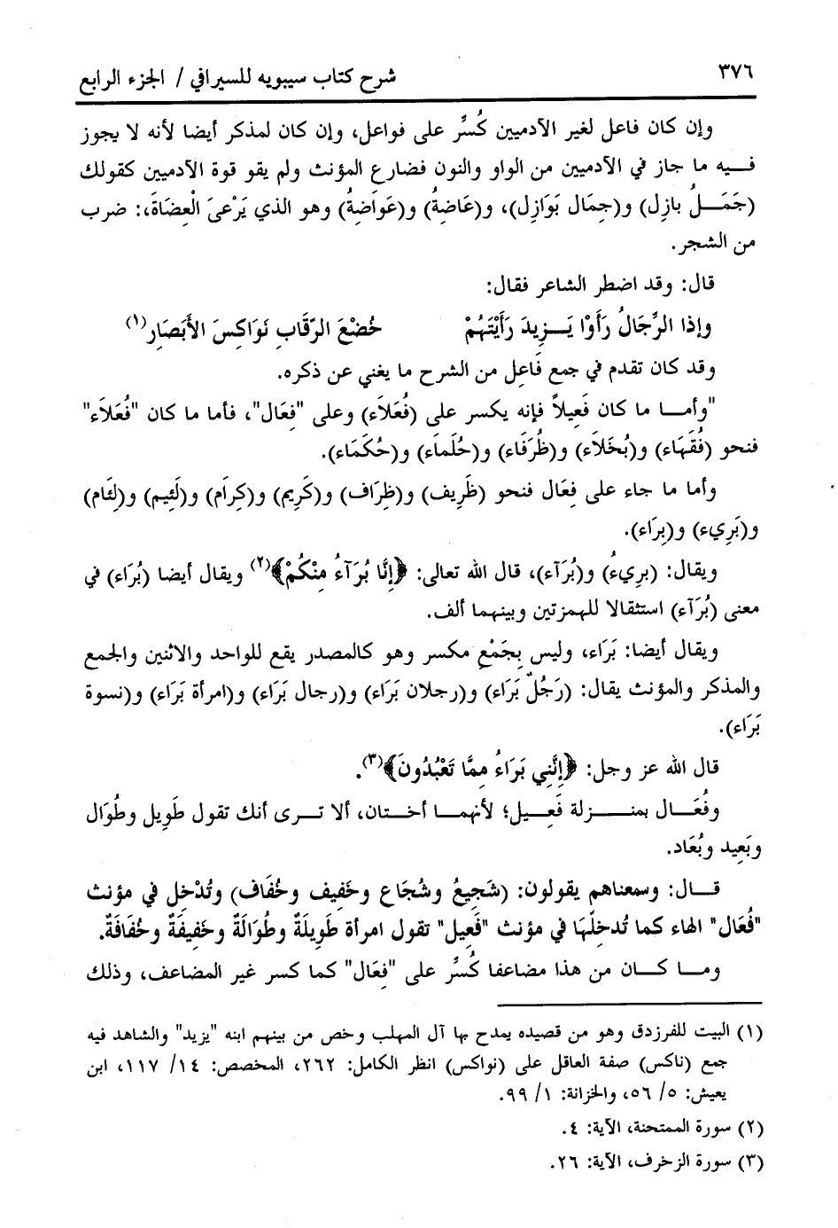 " وأما ما كان فعيلا فإنه يكسر على (فعلاء) وعلى " فعال "، فأما ما كان " فعلاء " فنحو (فقهاء) و (بخلاء) و (ظرفاء) و (حلماء) و (حكماء).