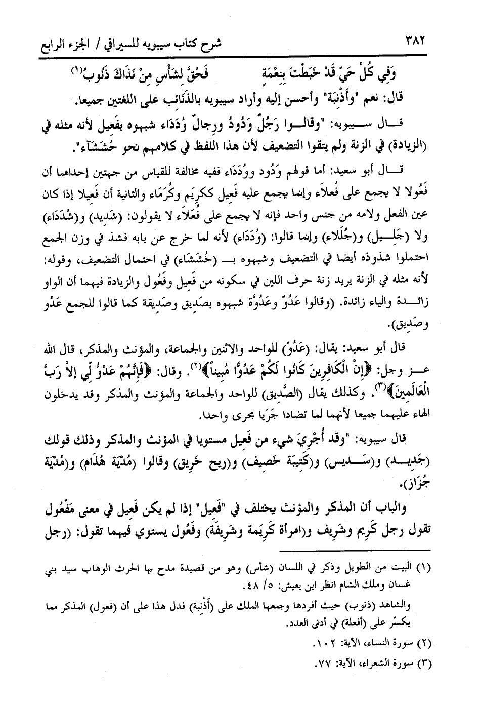 والشاهد (ذنوب) حيث أفردها وجمعها الملك على (أذنبة) فدل هذا على أن (فعول) المذكر مما يكسّر على (أفعلة) في أدنى العدد.