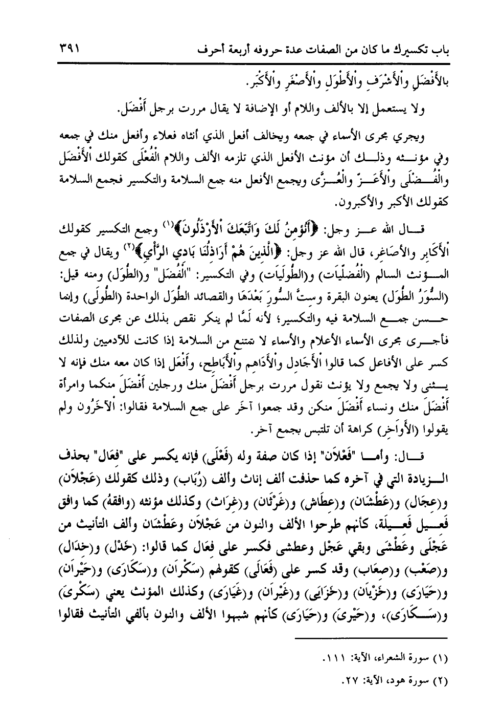 (السّور الطّول) يعنون البقرة وستّ السّور بعدها والقصائد الطّول الواحدة (الطّولى) وإنما حسن جمع السلامة فيه والتكسير؛ لأنه لمّا لم ينكر نقص بذلك عن مجرى الصفات فأجرى مجرى الأسماء الأعلام والأسماء لا تمتنع من السلامة إذا كانت للآدميين ولذلك كسر على الأفاعل كما قالوا الأجادل والأداهم والأباطح، وأفعل إذا كان معه منك فإنه لا يثنى ولا يجمع ولا يؤنث نقول مررت برجل أفضل منك ورجلين أفضل منكما وامرأة أفضل منك ونساء أفضل منكن وقد جمعوا آخر على جمع السلامة فقالوا: الآخرون ولم يقولوا (الأواخر) كراهة أن تلتبس بجمع آخر.