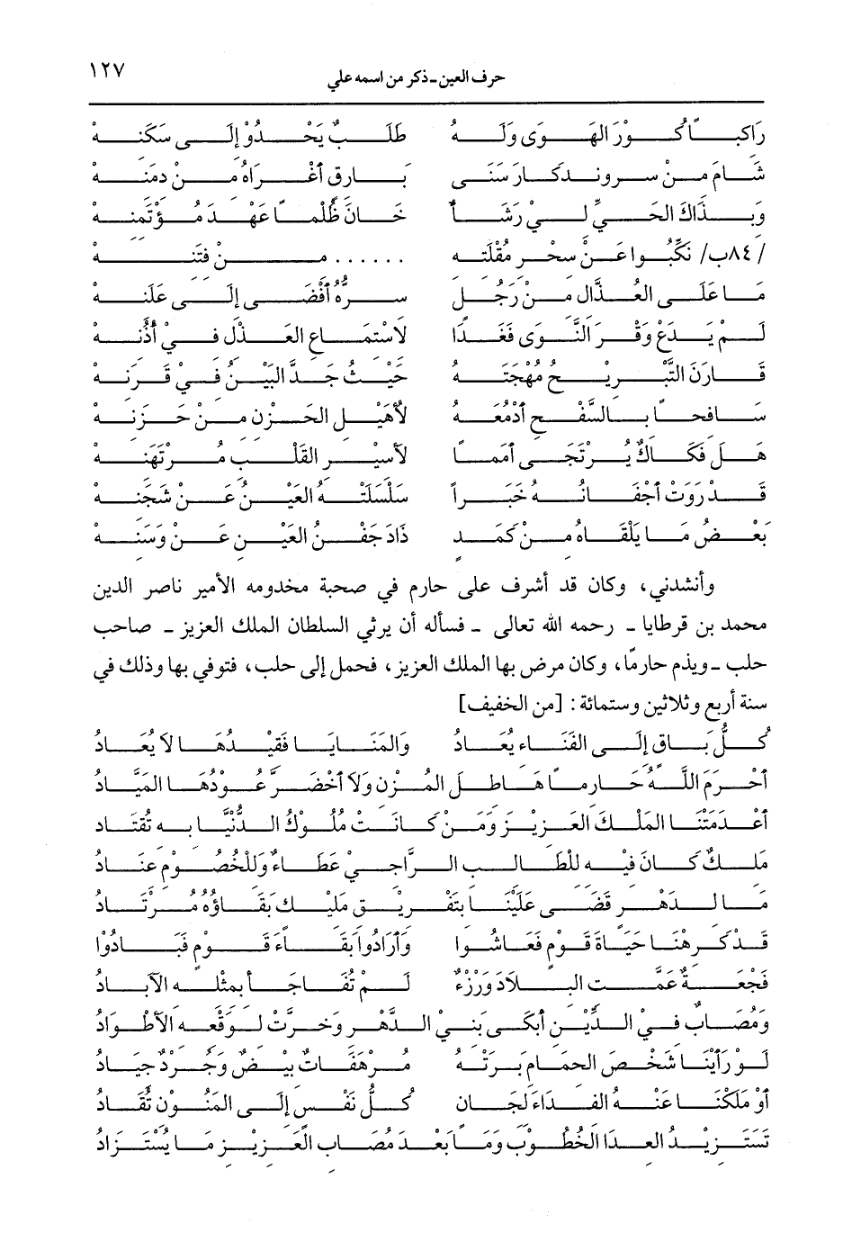 وأنشدني، وكان قد أشرف على حارم في صحبة مخدومه الأمير ناصر الدين محمد بن قرطايا -رحمه الله تعالى- فسأله أن يرثي السلطان الملك العزيز -صاحب حلب- ويذم حارمًا، وكان مرض بها الملك العزيز، فحمل إلى حلب، فتوفي بها وذلك في سنة أربع وثلاثين وستمائة: [من الخفيف]