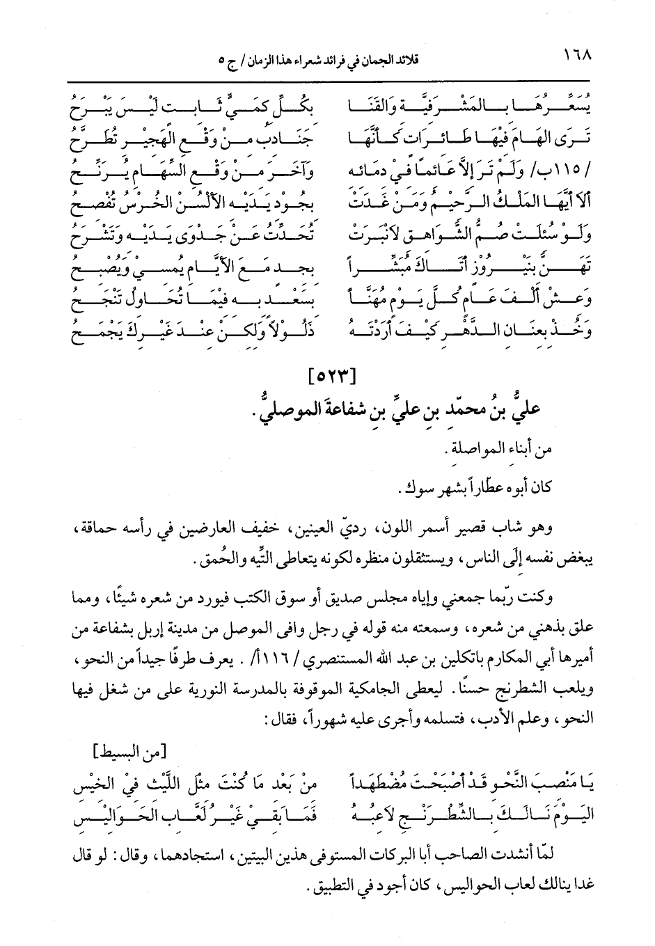 وكنت ربّما جمعني وإياه مجلس صديق أو سوق الكتب فيورد من شعره شيئًا، ومما علق بذهني من شعره، وسمعته منه قوله في رجل وافى الموصل من مدينة إربل بشفاعة من أميرها أبي المكارم باتكلين بن عبد الله المستنصري /116 أ/. يعرف طرفًا جيدًا من النحو، ويلعب الشطرنج حسنًا. ليعطي الجامكية الموقوفة بالمدرسة النورية على من شغل فيها النحو، وعلم الأدب، فتسلمه وأجرى عليه شهورًا، فقال: