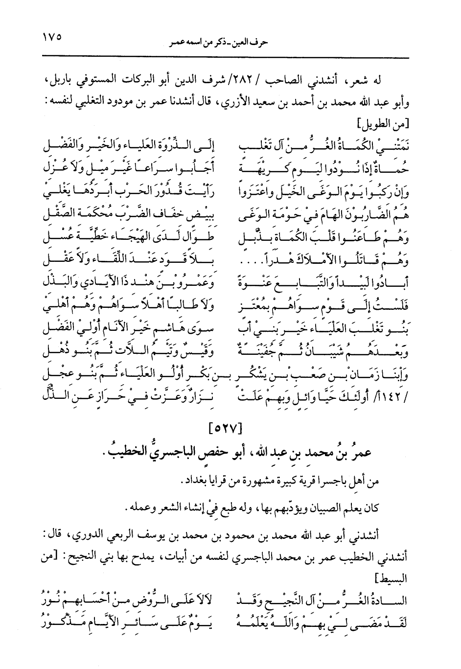له شعر، أنشدني الصاحب /282/ شرف الدين أبو البركات المستوفي باربل، وأبو عبد الله محمد بن أحمد بن سعيد الأزري، قال أنشدنا عمر بن مودود التغلبي لنفسه: [من الطويل]