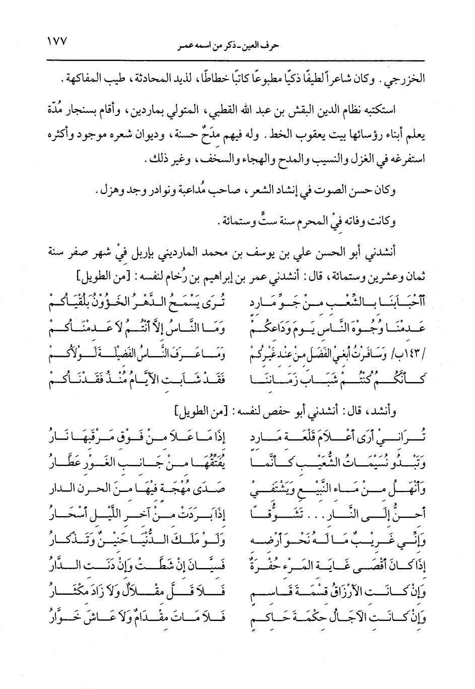 أنشدني أبو الحسن علي بن يوسف بن محمد المارديني بإربل في شهر صفر سنة ثمان وعشرين وستمائة، قال: أنشدني عمر بن إبراهيم بن رخام لنفسه: [من الطويل]