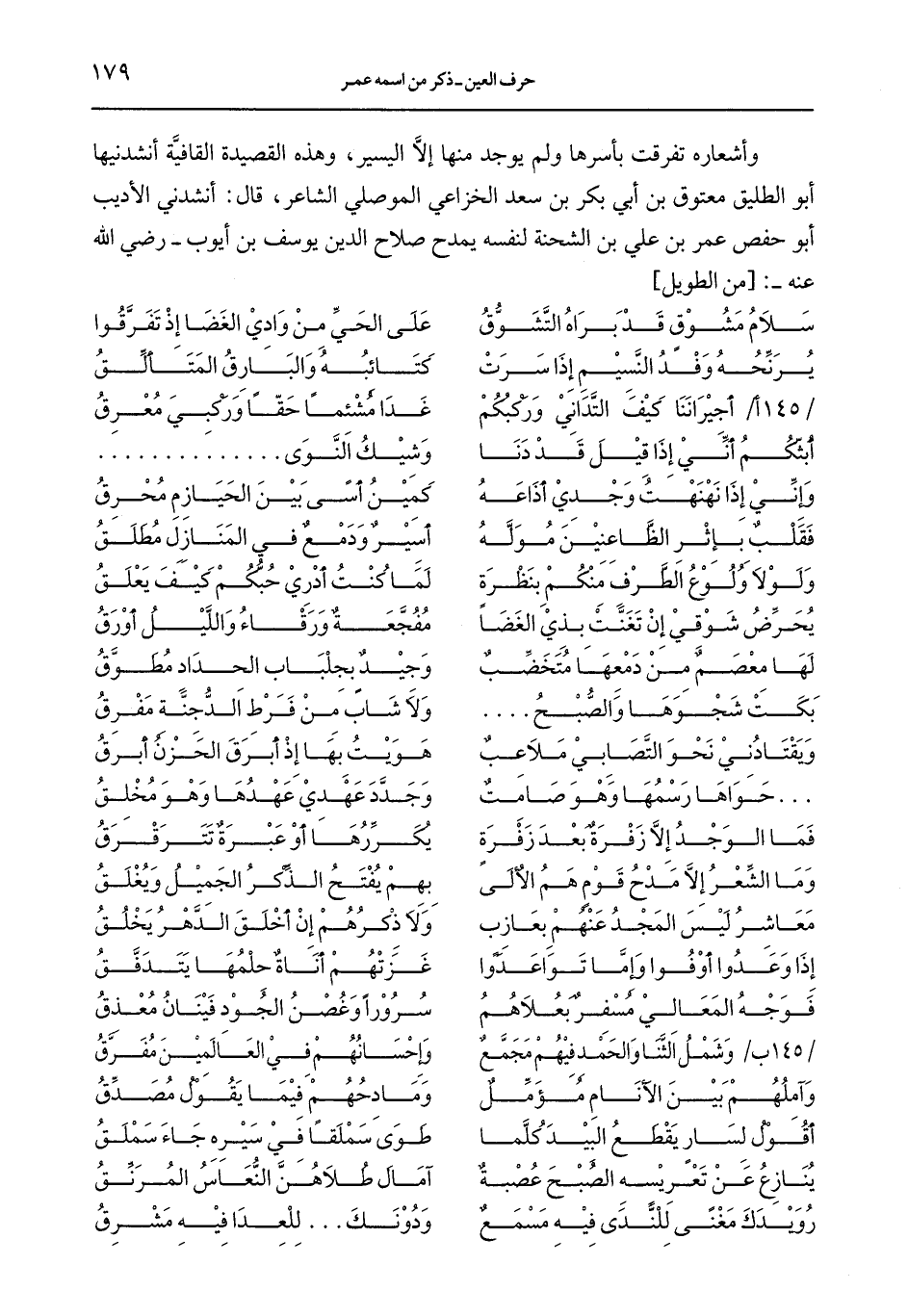وأشعاره تفرقت بأسرها ولم يوجد منها إلاَّ اليسير، وهذه القصيدة القافيَّة أنشدنيها أبو الطليق معتوق بن أبي بكر بن سعد الخزاعي الموصلي الشاعر، قال: أنشدني الأديب أبو حفص عمر بن علي بن الشحنة لنفسه يمدح صلاح الدين يوسف بن أيوب –رضي الله عنه-: [من الطويل]