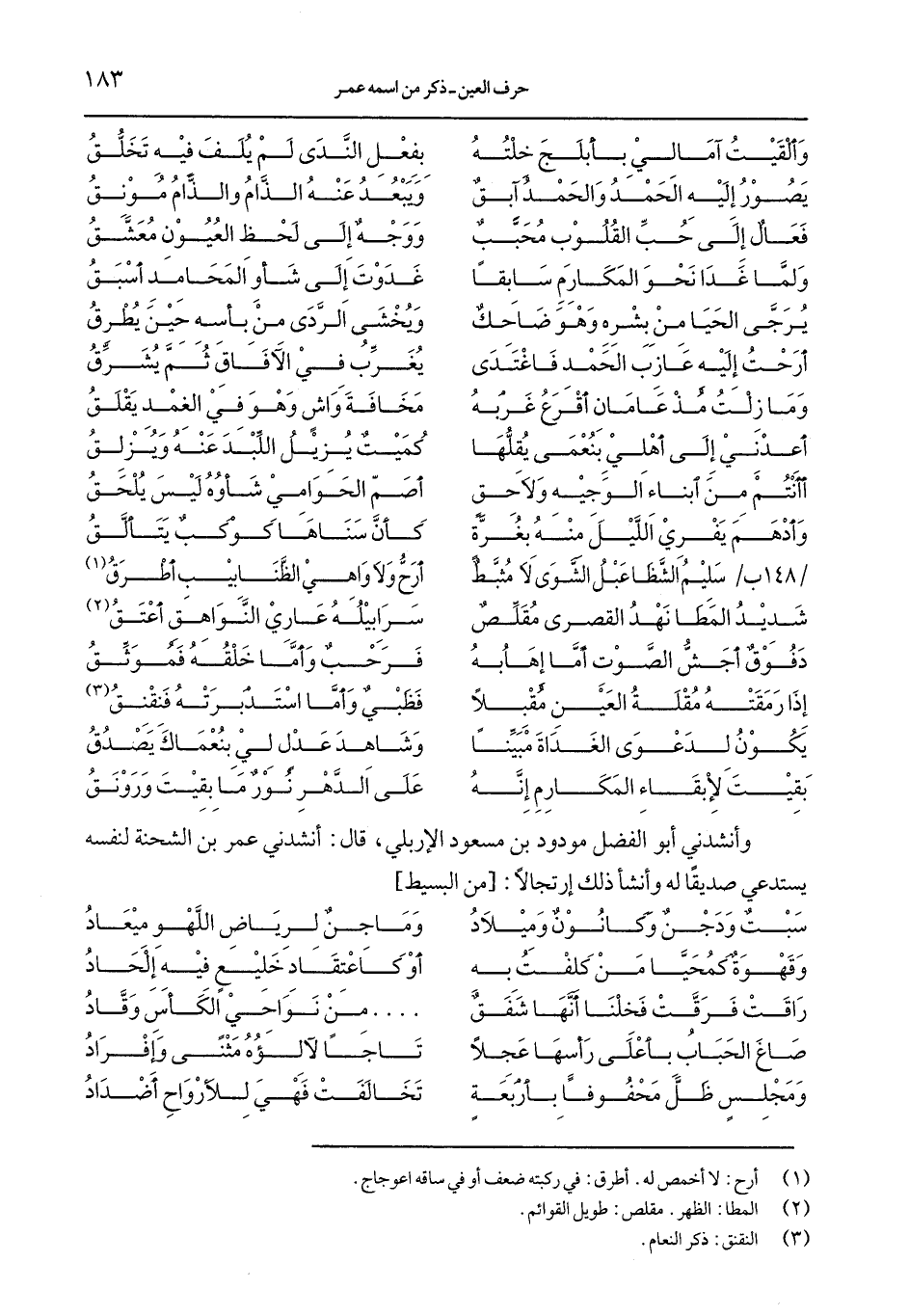 وأنشدني أبو الفضل مودد بن مسعود الإربلي، قال: أنشدني عمر بن الشحنة لنفسه يستدعي صديقًا له وأنشأ ذلك إرتجالاً: [من البسيط]