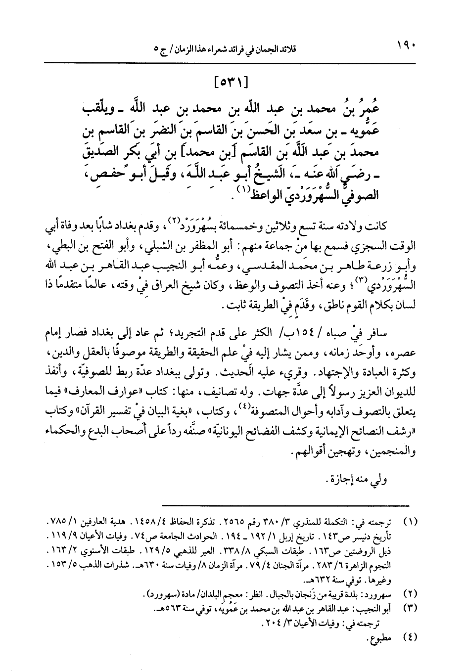 سافر في صباه /154 ب/ الكثر على قدم التجريد؛ ثم عاد إلى بغداد فصار غمام عصره، وأوحد زمانه، وممن يشار إليه في علم الحقيقة والطريقة موصوفًا بالعقل والدين، وكثرة العبادة والاجتهاد. وقريء عليه الحديث. وتولى ببغداد عدّة ربط للصوفيّة، وأنفذ للديوان العزيز رسولاً إلى عدَّة جهات. وله تصانيف، منها: كتاب "عوارف المعارف" فيما يتعلق بالتصوف وآدابه وأحوال المتصوفة، وكتاب، "بغية البيان في تفسير القرآن" وكتاب "رشف النصائح الإيمانية وكشف الفضائح اليونانيّة" صنَّفه ردًا على أصحاب البدع والحكماء والمنجمين، وتهجين أقوالهم.