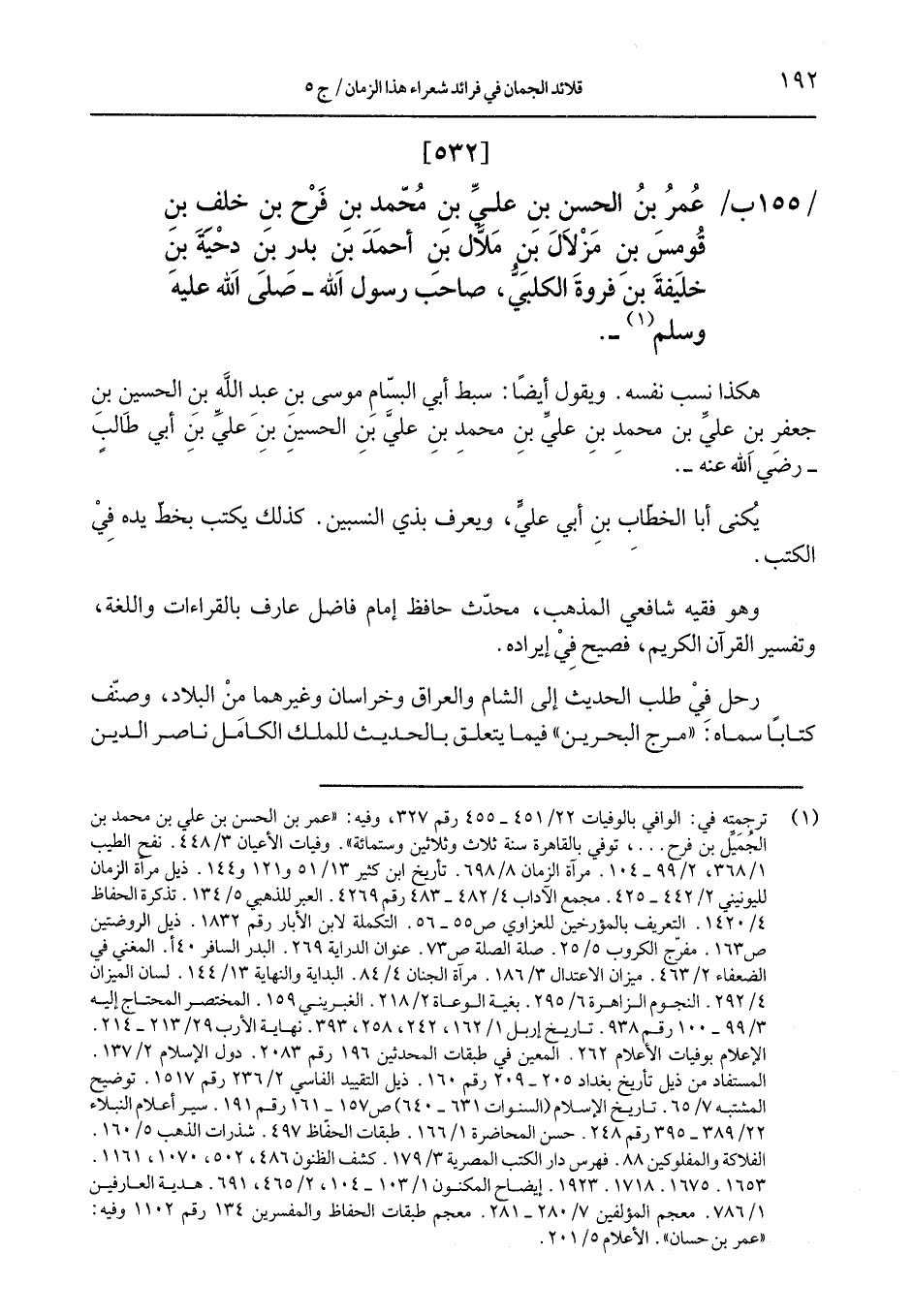 /155 ب/ عمر بن الحسن بن عليِّ بن محّمد بن فرح بن خلف بن قومس بن مزلال بن ملاَّل بن أحمد بن بدر بن دخية بن خليفة بن فروة الكلبيُّ، صاحب رسول الله –صلى الله عليه وسلم-