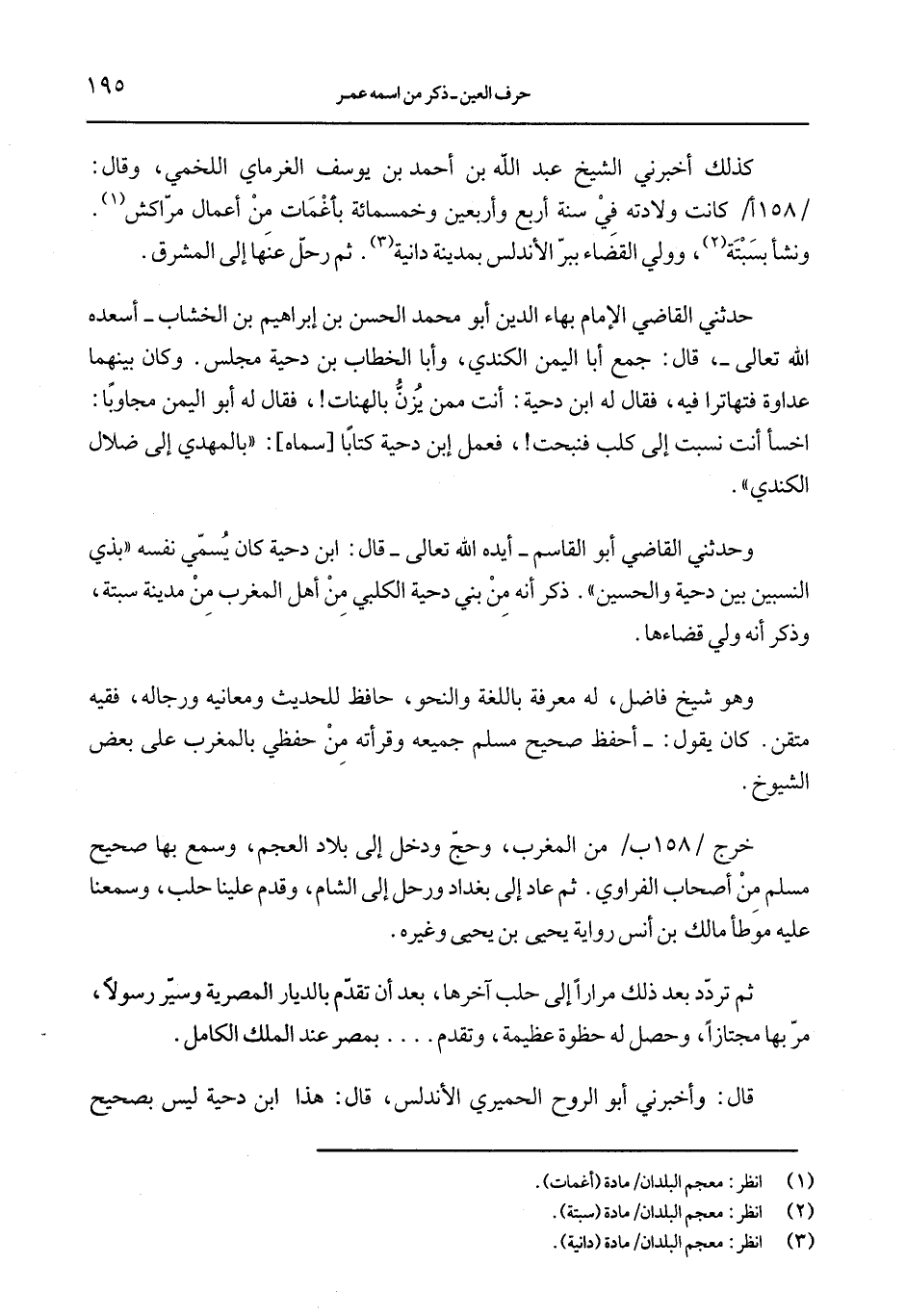 وحدثني القاضي أبو القاسم –أيده الله تعالى- قال: ابن دحية كان يسمّى نفسه "بذي النسبين بين دحية والحسن". ذكر أنه من بني دحية الكلبي من أهل المغرب من مدينة سبته، وذكر أنه ولي قضاءها.