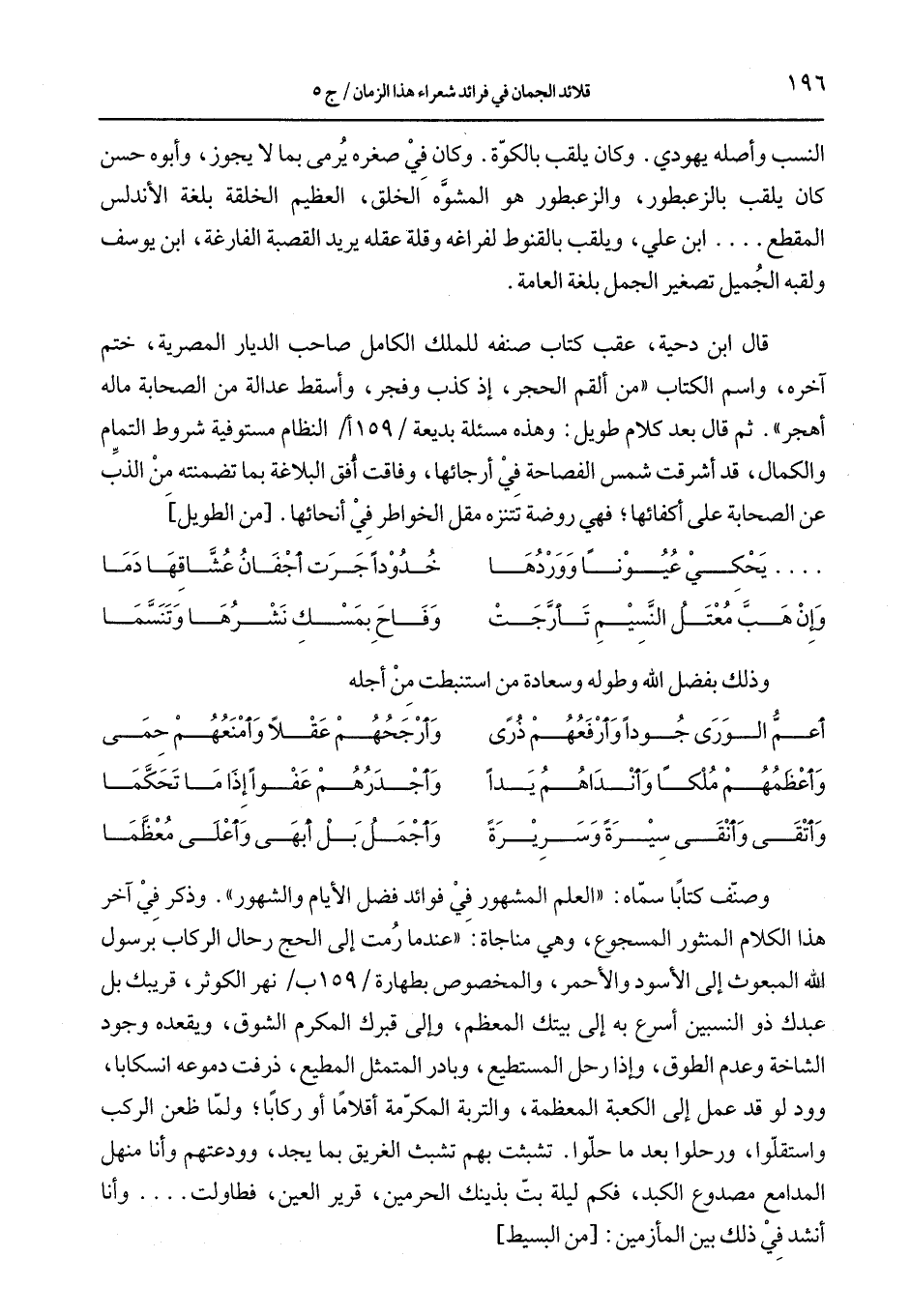 قال ابن دحية، عقب كتاب صنفه للملك الكامل صاحب الديار المصرية، ختم آخره، واسم الكتاب " من ألقم الحجر، إذ كذب وفجر، وأسقط عدالة من الصحابة ماله أهجر". ثم قال بعد كلام طويل: وهذه مسئلة بديعة /159 أ/ النظام مستوفية شروط التمام والكمال، قد أشرقت شمس الفصاحة في أرجائها، وفاقت أفق البلاغة بما تضمنته من الذبِّ عن الصحابة على اكفائها؛ فهي روضة تتنزه مقل الخواطر في أنحائها. [من الطويل]