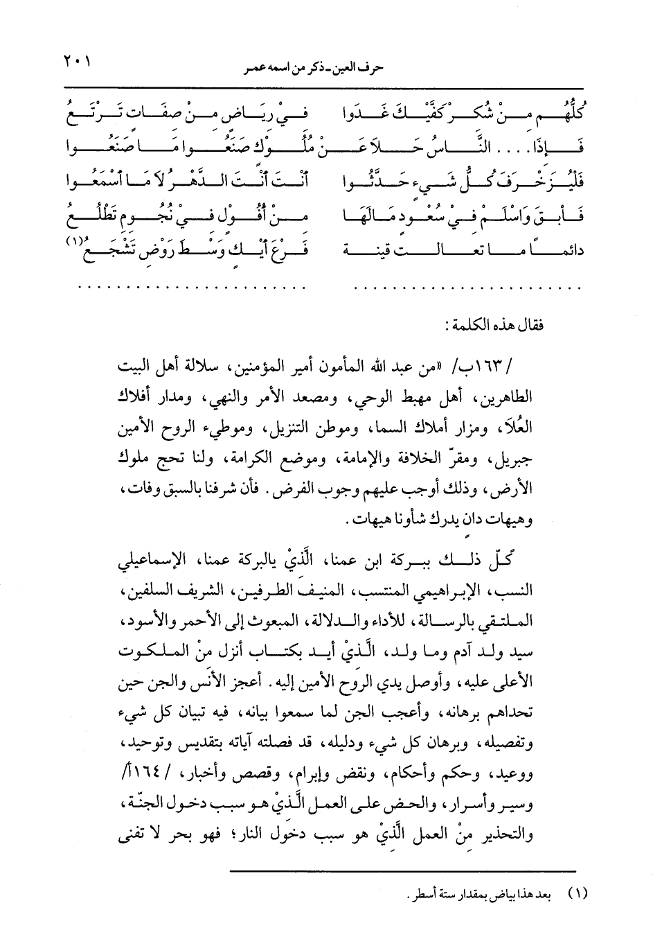 /163 ب/ "من عبد الله المأمون أمير المؤمنين، سلالة أهل البيت الطاهرين، أهل مهبط الوحي، ومصعد الأمر والنهي، ومدار أفلاك العلا، ومزار أملاك السما، وموطن التنزيل، وموطيء الروح الأمين جبريل، ومقرّ الخلافة والإمامة، وموضع الكرامة، ولنا تحج ملوك الأرض، وذلك أوجب عليهم وجوب الفرض. فأن شرفنا بالسبق وفات، وهيهات دانٍ يدرك شأونا هيهات.