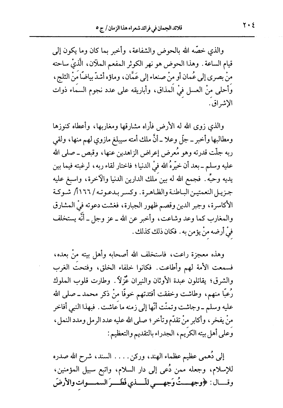 وهذه معجزة راعت، فاستخلف الله أصحابه وأهل بيته من بعده، فسمعت الأمة لهم وأطاعت. فكانوا خلفاء الخلق، وفتحت الغرب والشرق؛ يقاتلون عبدة الأوثان والنيران عزلاً. وطارت قلوب الملوك رعبًا منهم، وطاشت وخفقت أفئدتهم خوفًا من ذكر محمد –صلى الله عليه وسلم- وجاشت وتمنّت أنّها إلى زمنه ما عاشت. فبهذا النبي أفاخر من يفخر، وأكابر من تقدّم وتأخر؛ صلى الله عليه عدد الرمل ومدد النمل، وعلى أهل بيته الكريم، الجدراء بالتقديم والتعظيم: