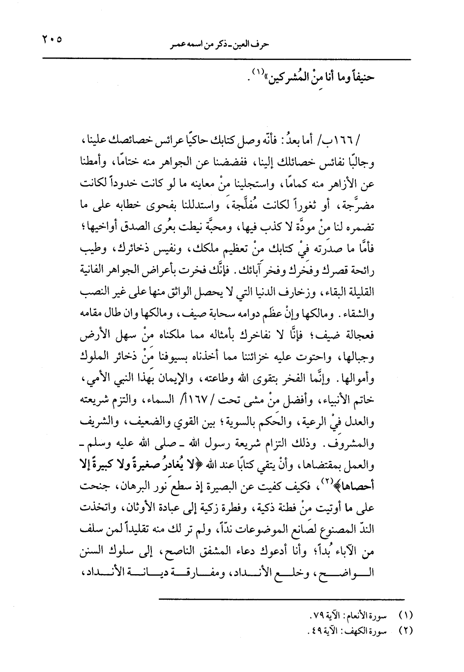 /166 ب/ أما بعد: فأنّه وصل كتابك حاكيًا عرائس خصائصك علينا، وجالبًا نفائس خصائلك إلينا، ففضضنا عن الجواهر منه ختامًا، وأمطنا عن الأزاهر منه كمامًا، واستجلينا من معاينه ما لو كانت خدودًا لكانت مضرَّجة، أو ثغورًا لكانت مفلَّجة، واستدللنا بفحوى خطابه على ما تضمره لنا من مودَّة لا كذب فيها، ومحبَّة نيطت بعرى الصدق أواخيها؛ فأمَّا ما صدرته في كتابك من تعظيم ملكك، ونفيس ذخائرك، وطيب رائحة قصرك وفخرك وفخر آبائك. فإنَّك فخرت بأعراض الجواهر الفانية القليلة البقاء، وزخارف الدنيا التي لا يحصل الواثق منها على غير النصب والشقاء. ومالكها وإن عظم دوامه سحابة صيف، ومالكها وان طال مقامه فعجالة ضيف؛ فإنَّا لا نفاخرك بأمثاله مما ملكناه من سهل الأرض وجبالها، واحتوت عليه خزائننا مما أخذناه بسيوفنا من ذخائر الملوك وأموالها. وإنَّما الفخر بتقوى الله وطاعته، والإيمان بهذا النبي الأمي، خاتم الأنبياء، وأفضل من مشى تحت /167 أ/ السماء، والتزم شريعته والعدل في الرعية، والحكم بالسوية؛ بين القوي والضعيف، والشريف والمشروف. وذلك التزام شيعة رسول الله –صلى الله عليه وسلم- والعمل بمقتضاها، وأن يتقي كتابًا عند الله {لا يغادر صغيرة ولا كبيرة إلا أحصاها}، فكيف كفيت عن البصيرة إذ سطع نور البرهان، جنحت على ما أوتيت من فطنة ذكية، وفطرة زكية إلى عبادة الأوثان، واتخذت الندّ المصنوع لصانع الموضوعات ندّاً، ولم تر لك منه تقليدّا لمن سلف من الآباء بدّا، وأنا أدعوك دعاء المشفق الناصح، إلى سلوك السنن الواضح، وخلع الأنداد، ومفارقة ديانة الأنداد،
