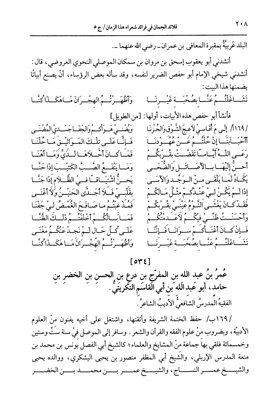 أنشدني أبو يعقوب إسحق بن مروان بن سمكان الموصلي النحوي العروضي، قال: أنشدني شيخي الإمام أبو حفص الضرير لنفسه، وقد سأله بعض الرؤساء، أن يصنع أبياتًا يضمنها هذا البيت: