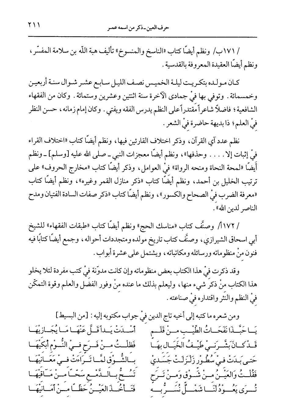 171 ب/ ونظم أيضًا كتاب "الناسخ والمنسوخ" تأليف هبة الله بن سلامة المفسّر، ونظم أيضًا العقيدة المعروفة بالقدسية.