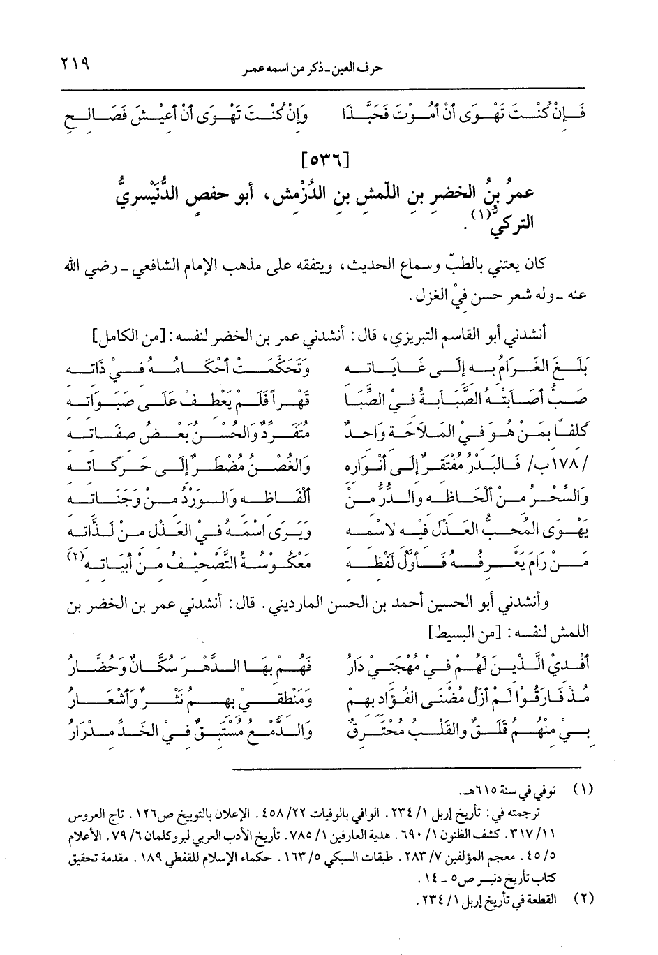 وأنشدني أبو الحسين احمد بن الحسن المارديني. قال: أنشدني عمر بن الحضر بن اللمش لنفسه: [من البسيط]
