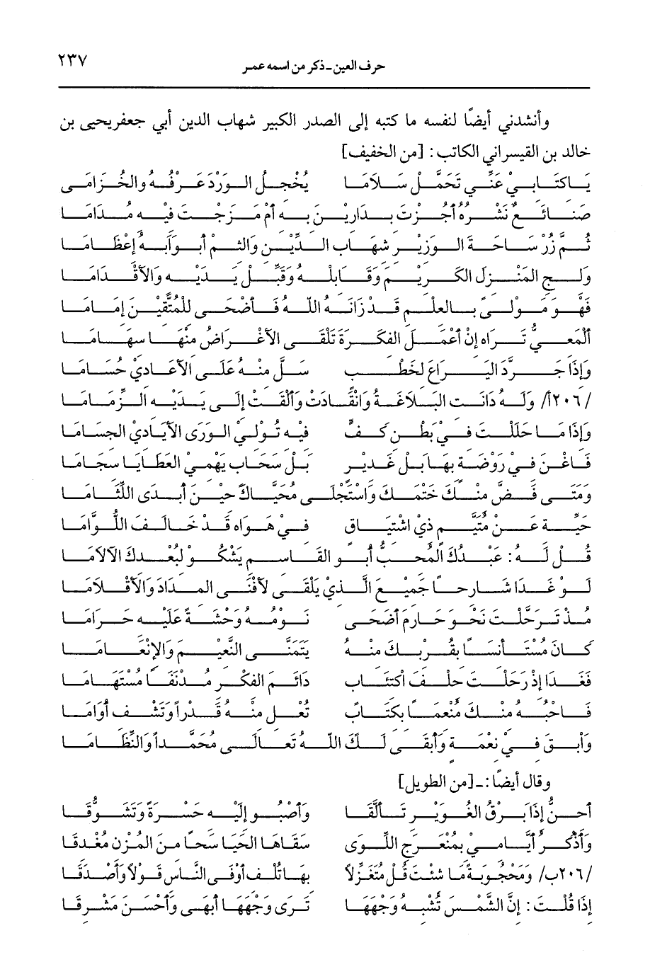 وأنشدني أيضًا لنفسه ما كتبه إلى الصدر الكبير شهاب الدين أبي جعفر يحيى بن خالد بن القيسراني الكاتب: [من الخفيف]