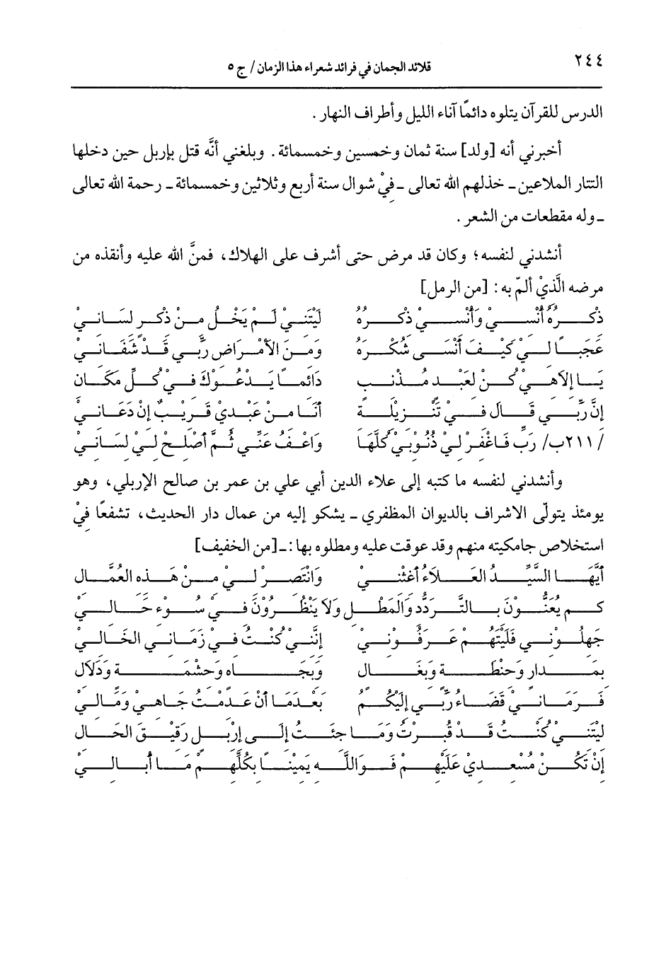 وأنشدني لنفسه ما كتبه إلى علاء الدين أبي علي بن عمر بن صالح الإربلي، وهو يومئذ يتولّى الاشراف بالديوان المظفري –يشكو إليه من عمال دار الحديث، تشفعًا في استخلاص جامكيته منهم وقد عوقت عليه ومطلوه بها: -[من الخفيف]