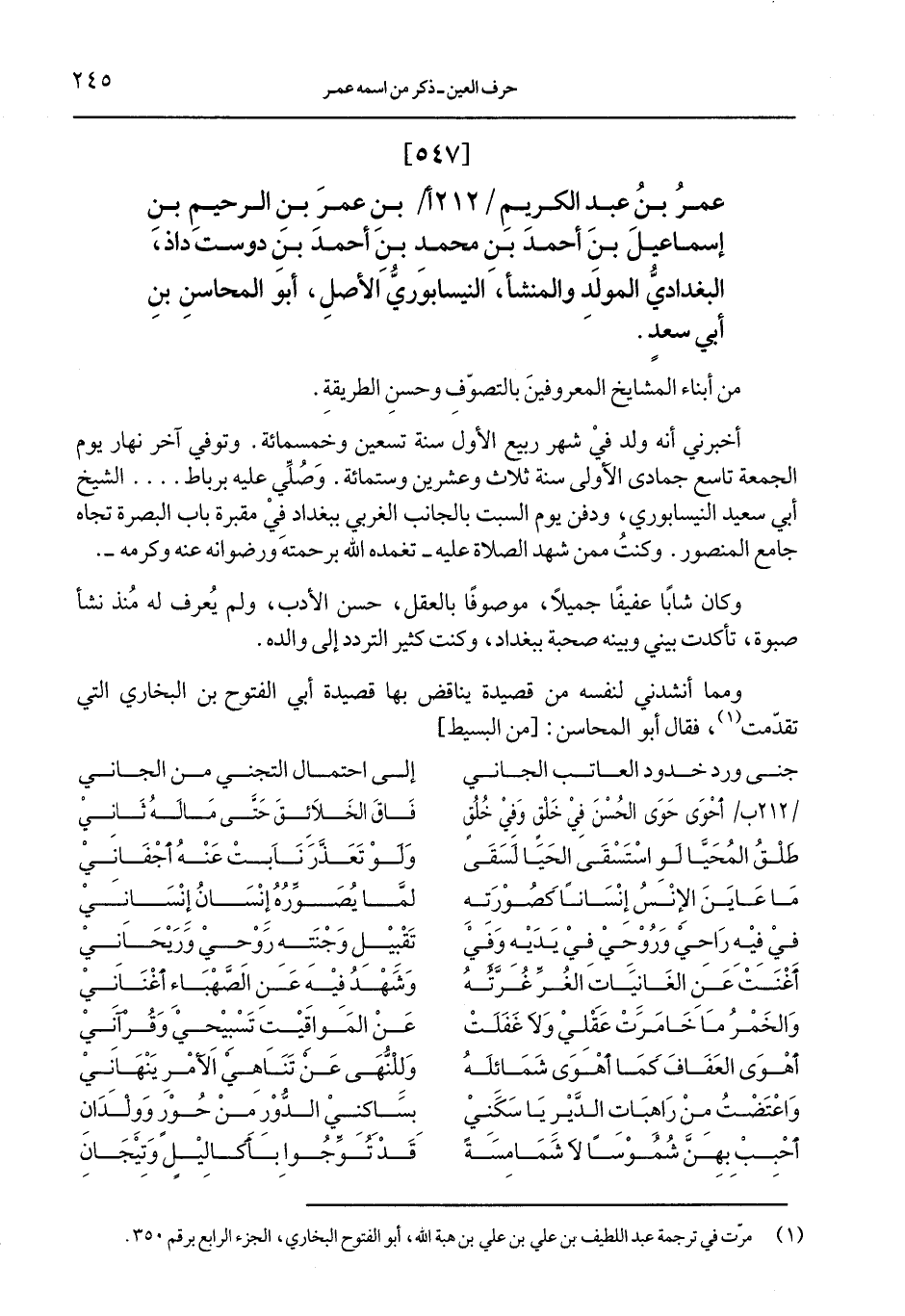 عمر بن عبد الكريم /212 أ/ بن عمر بن الرحيم بن إسماعيل بن أحمد بن محمد بن أحمد بن دوت داذ، البغداديُّ المولد والمنشأ، النيسابوريُّ الأصل، أبو المحاسن بن أبي سعدٍ.