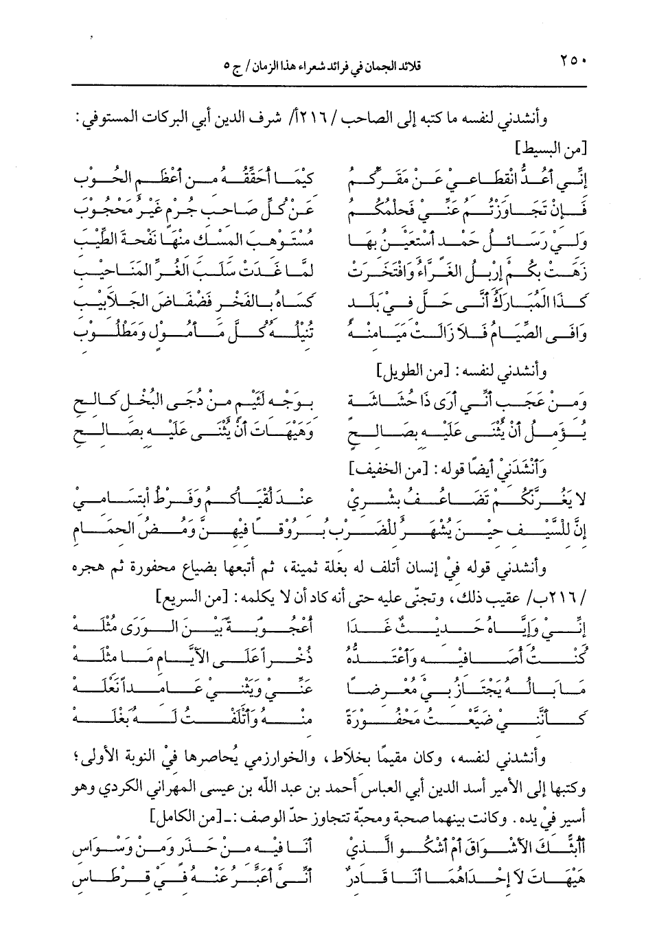 وأنشدني لنفسه، وكان مقيمًا بخلاط، والخوارزمي يحاصرها في النوبة الأولى؛ وكتبها إلى الأمير أسد الدين أبي العباس أحمد بن عبد الله بن عيسى المهراني الكردي وهو أسير في يده. وكانت بينهما صحبة ومحبّة تتجاوز حدّ الوصف: -[من الكامل]