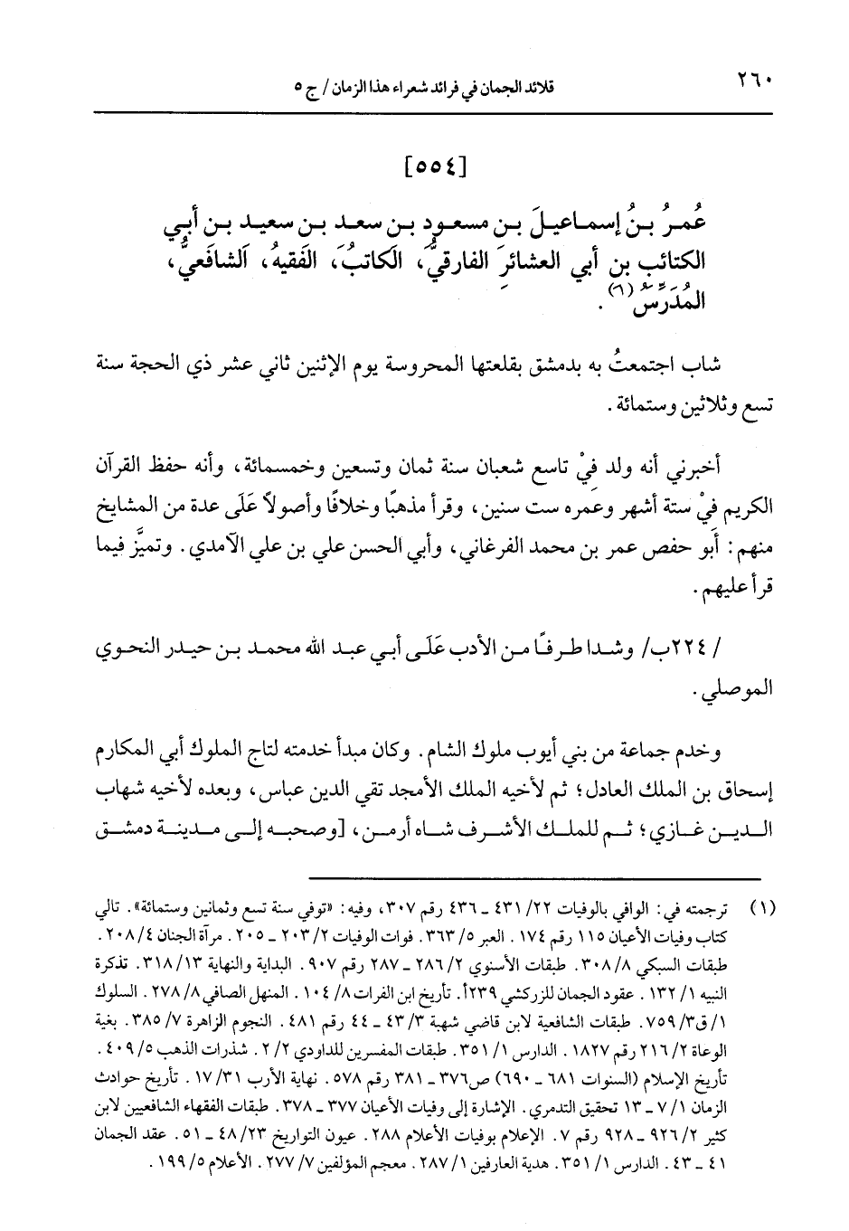 عمر بن إسماعيل بن مسعود بن سعد بن سعيد بن أبي الكتائب بن أبي العشائر الفارقيُّ، الكاتب، الفقيه، الشافعي، المدرِّس.