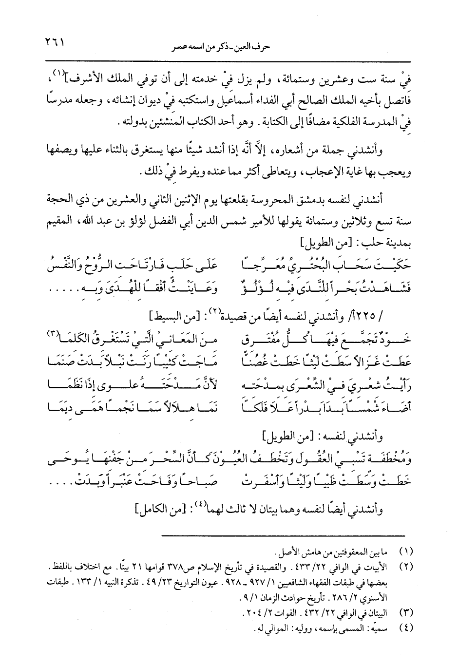 أنشدني لنفسه بدمشق المروسة بقلعتها يوم الإثنين الثاني والعشرين من ذي الحجة سنة تسع وثلاثين وستمائة يقولها للأمير شمس الدين أبي الفضل لؤلؤ بن عبد الله، المقيمة بمدينة حلب: [من الطويل]
