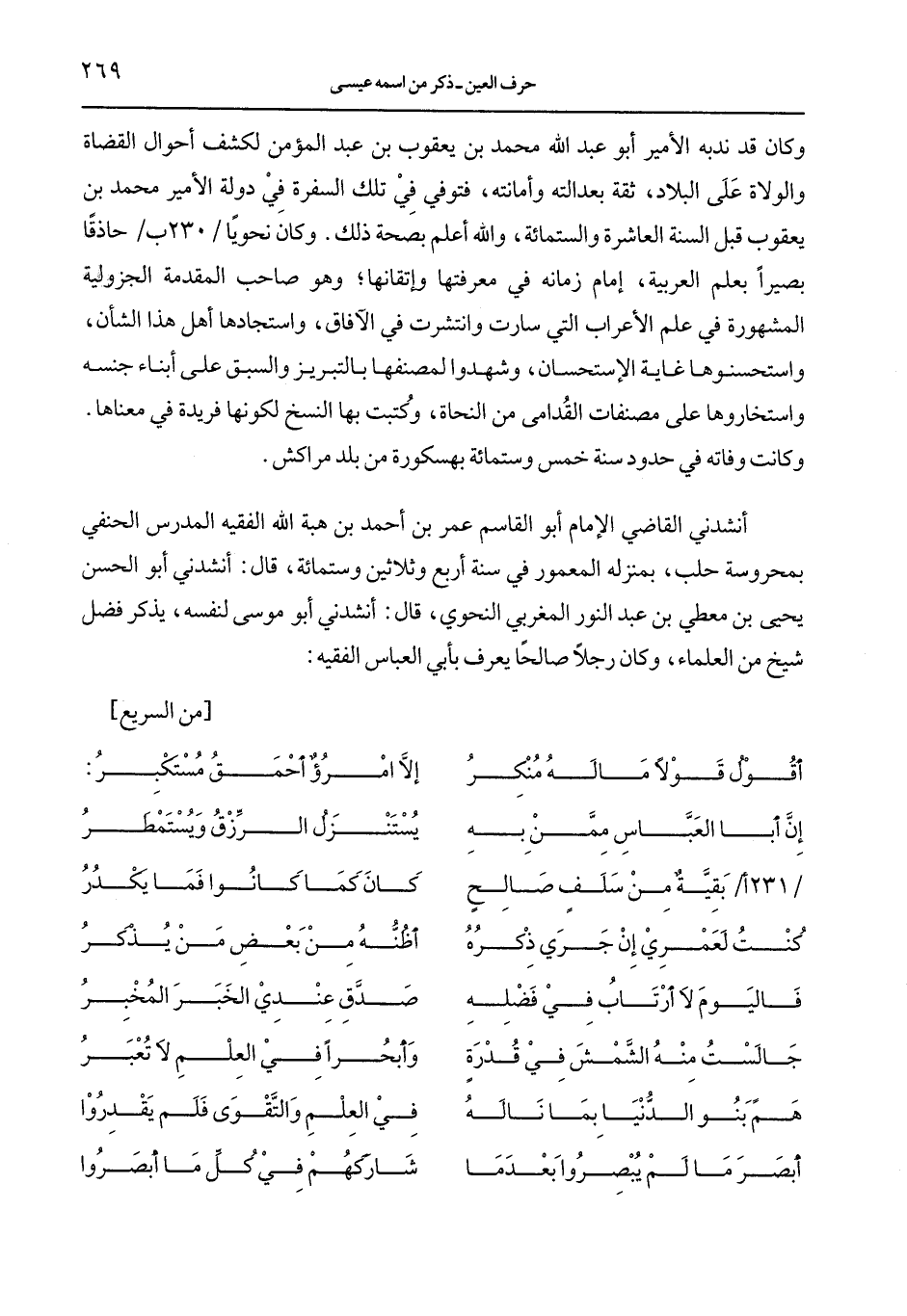 أنشدني القاضي الإمام أبو القاسم عمر بن أحمد بن هبة الله الفقيه المدرس الحنفي بمحروسة حلب، بمنزله المعمور في سنة أربع وثلاثين وستمائة، قال: أنشدني أبو الحسن يحيى بن معطي بن عبد النور المغربي النحوي، قال: أنشدني أبو موسى لنفسه، يذكر فضل شيخ من العلماء، وكان رجلاً صالحًا يعرف بأبي العباس الفقيه: