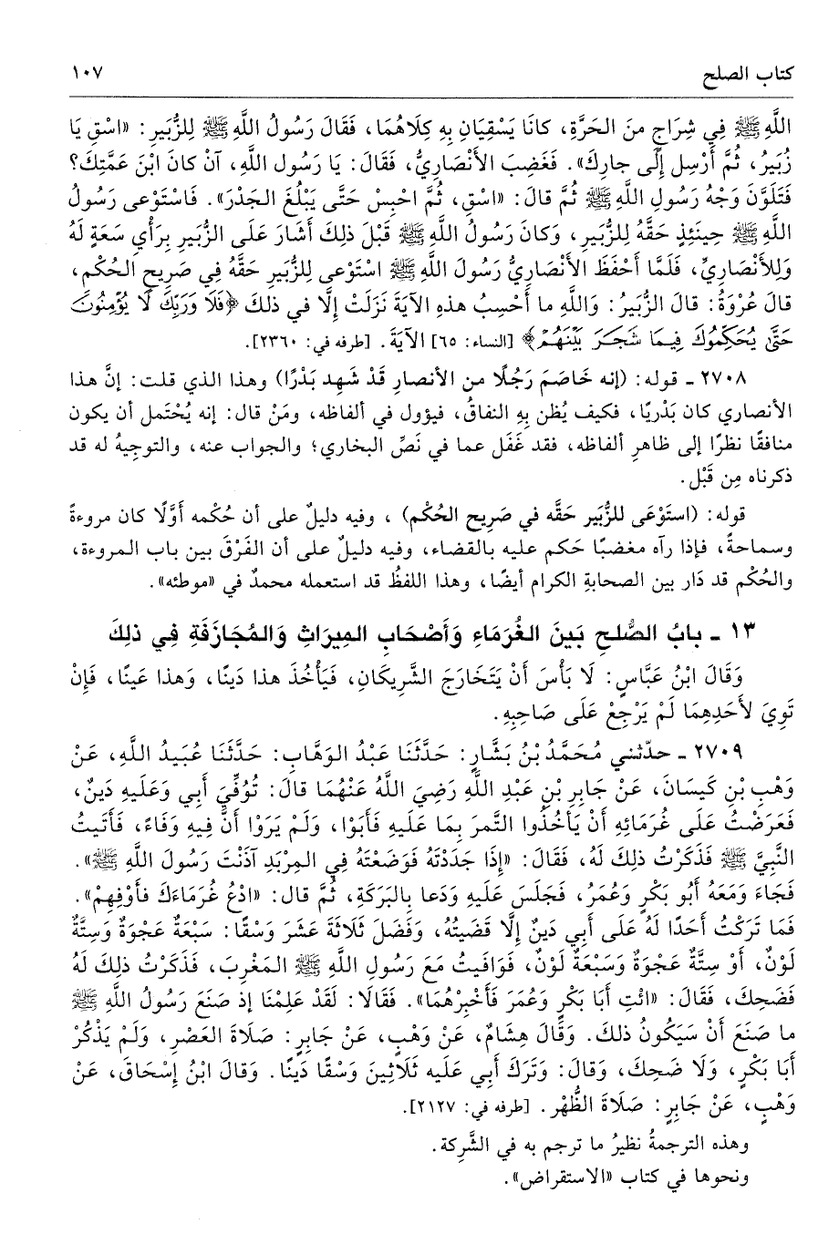 2708 - قوله: (إنه خَاصَمَ رَجُلا من الأنصارِ قَدْ شَهِد بَدْرًا) وهذا الذي قلت: إنَّ هذا الأنصاري كان بَدْريًا، فكيف يُظنِ بِهِ النفاقُ، فيؤول في ألفاظه، ومَنْ قال: إنه يُحْتَمل إن يكون منافقًا نظرًا إلى ظاهرِ ألفاظه، فقد غَفَل عما في نَصِّ البخاري؛ والجواب عنه، والتوجِيهُ له ذكرناه مِن قَبْل.