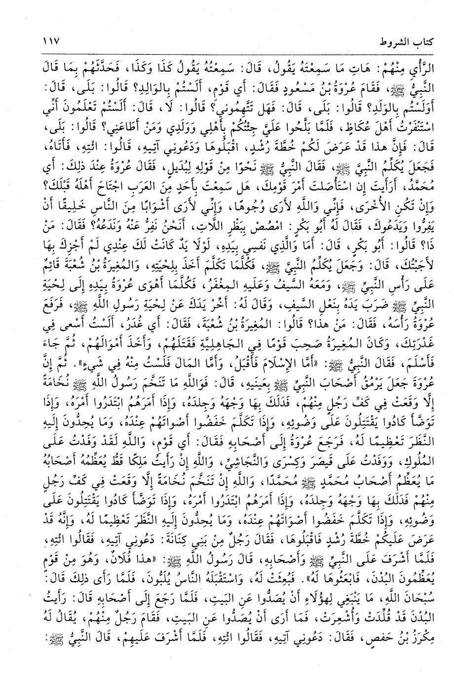 الرَّأْىِ مِنْهُمْ هَاتِ مَا سَمِعْتَهُ يَقُولُ. قَالَ سَمِعْتُهُ يَقُولُ كَذَا وَكَذَا، فَحَدَّثَهُمْ بِمَا قَالَ النَّبِىُّ - صلى الله عليه وسلم -. فَقَامَ عُرْوَةُ بْنُ مَسْعُودٍ فَقَالَ أَىْ قَوْمِ أَلَسْتُمْ بِالْوَالِدِ قَالُوا بَلَى. قَالَ أَوَلَسْتُ بِالْوَلَدِ قَالُوا بَلَى. قَالَ فَهَلْ تَتَّهِمُونِى. قَالُوا لاَ. قَالَ أَلَسْتُمْ تَعْلَمُونَ أَنِّى اسْتَنْفَرْتُ أَهْلَ عُكَاظٍ، فَلَمَّا بَلَّحُوا عَلَىَّ جِئْتُكُمْ بِأَهْلِى وَوَلَدِى وَمَنْ أَطَاعَنِى قَالُوا بَلَى. قَالَ فَإِنَّ هَذَا قَدْ عَرَضَ لَكُمْ خُطَّةَ رُشْدٍ، اقْبَلُوهَا وَدَعُونِى آتِهِ. قَالُوا ائْتِهِ. فَأَتَاهُ فَجَعَلَ يُكَلِّمُ النَّبِىَّ - صلى الله عليه وسلم - فَقَالَ النَّبِىُّ - صلى الله عليه وسلم - نَحْوًا مِنْ قَوْلِهِ لِبُدَيْلٍ، فَقَالَ عُرْوَةُ عِنْدَ ذَلِكَ أَىْ مُحَمَّدُ، أَرَأَيْتَ إِنِ اسْتَأْصَلْتَ أَمْرَ قَوْمِكَ هَلْ سَمِعْتَ بِأَحَدٍ مِنَ الْعَرَبِ اجْتَاحَ أَهْلَهُ قَبْلَكَ وَإِنْ تَكُنِ الأُخْرَى، فَإِنِّى وَاللَّهِ لأَرَى وُجُوهًا، وَإِنِّى لأَرَى أَوْشَابًا مِنَ النَّاسِ خَلِيقًا أَنْ يَفِرُّوا وَيَدَعُوكَ. فَقَالَ لَهُ أَبُو بَكْرٍ امْصُصْ بَظْرَ اللاَّتِ، أَنَحْنُ نَفِرُّ عَنْهُ وَنَدَعُهُ فَقَالَ مَنْ ذَا قَالُوا أَبُو بَكْرٍ. قَالَ أَمَا وَالَّذِى نَفْسِى بِيَدِهِ لَوْلاَ يَدٌ كَانَتْ لَكَ عِنْدِى لَمْ أَجْزِكَ بِهَا لأَجَبْتُكَ. قَالَ وَجَعَلَ يُكَلِّمُ النَّبِىَّ - صلى الله عليه وسلم - فَكُلَّمَا تَكَلَّمَ أَخَذَ بِلِحْيَتِهِ، وَالْمُغِيرَةُ بْنُ شُعْبَةَ قَائِمٌ عَلَى رَأْسِ النَّبِىِّ - صلى الله عليه وسلم - وَمَعَهُ السَّيْفُ وَعَلَيْهِ الْمِغْفَرُ، فَكُلَّمَا أَهْوَى عُرْوَةُ بِيَدِهِ إِلَى لِحْيَةِ النَّبِىِّ - صلى الله عليه وسلم - ضَرَبَ يَدَهُ بِنَعْلِ السَّيْفِ، وَقَالَ لَهُ أَخِّرْ يَدَكَ عَنْ لِحْيَةِ رَسُولِ اللَّهِ - صلى الله عليه وسلم -. فَرَفَعَ عُرْوَةُ رَأْسَهُ فَقَالَ مَنْ هَذَا قَالُوا الْمُغِيرَةُ بْنُ شُعْبَةَ. فَقَالَ أَىْ غُدَرُ، أَلَسْتُ أَسْعَى فِى غَدْرَتِكَ وَكَانَ الْمُغِيرَةُ صَحِبَ قَوْمًا فِى الْجَاهِلِيَّةِ، فَقَتَلَهُمْ، وَأَخَذَ أَمْوَالَهُمْ، ثُمَّ جَاءَ فَأَسْلَمَ فَقَالَ النَّبِىُّ - صلى الله عليه وسلم - «أَمَّا الإِسْلاَمَ فَأَقْبَلُ، وَأَمَّا الْمَالَ فَلَسْتُ مِنْهُ فِى شَىْءٍ». ثُمَّ إِنَّ عُرْوَةَ جَعَلَ يَرْمُقُ أَصْحَابَ النَّبِىِّ - صلى الله عليه وسلم - بِعَيْنَيْهِ. قَالَ فَوَاللَّهِ مَا تَنَخَّمَ رَسُولُ اللَّهِ - صلى الله عليه وسلم - نُخَامَةً إِلاَّ وَقَعَتْ فِى كَفِّ رَجُلٍ مِنْهُمْ فَدَلَكَ بِهَا وَجْهَهُ وَجِلْدَهُ، وَإِذَا أَمَرَهُمُ ابْتَدَرُوا أَمْرَهُ، وَإِذَا تَوَضَّأَ كَادُوا يَقْتَتِلُونَ عَلَى وَضُوئِهِ، وَإِذَا تَكَلَّمَ خَفَضُوا أَصْوَاتَهُمْ عِنْدَهُ، وَمَا يُحِدُّونَ إِلَيْهِ النَّظَرَ تَعْظِيمًا لَهُ، فَرَجَعَ عُرْوَةُ إِلَى أَصْحَابِهِ، فَقَالَ أَىْ قَوْمِ، وَاللَّهِ لَقَدْ وَفَدْتُ عَلَى الْمُلُوكِ، وَوَفَدْتُ عَلَى قَيْصَرَ وَكِسْرَى وَالنَّجَاشِىِّ وَاللَّهِ إِنْ رَأَيْتُ مَلِكًا قَطُّ، يُعَظِّمُهُ أَصْحَابُهُ مَا يُعَظِّمُ أَصْحَابُ مُحَمَّدٍ - صلى الله عليه وسلم - مُحَمَّدًا، وَاللَّهِ إِنْ تَنَخَّمَ نُخَامَةً إِلاَّ وَقَعَتْ فِى كَفِّ رَجُلٍ مِنْهُمْ، فَدَلَكَ بِهَا وَجْهَهُ وَجِلْدَهُ، وَإِذَا أَمَرَهُمُ ابْتَدَرُوا أَمْرَهُ وَإِذَا تَوَضَّأَ كَادُوا يَقْتَتِلُونَ عَلَى وَضُوئِهِ، وَإِذَا تَكَلَّمَ خَفَضُوا أَصْوَاتَهُمْ عِنْدَهُ، وَمَا يُحِدُّونَ إِلَيْهِ النَّظَرَ تَعْظِيمًا لَهُ، وَإِنَّهُ قَدْ عَرَضَ عَلَيْكُمْ خُطَّةَ رُشْدٍ، فَاقْبَلُوهَا. فَقَالَ رَجُلٌ مِنْ بَنِى كِنَانَةَ دَعُونِى آت