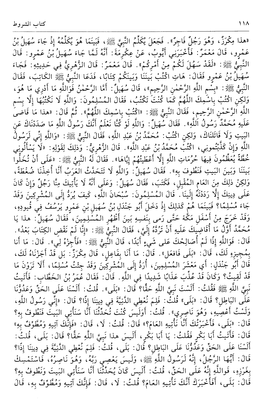 «هَذَا مِكْرَزٌ وَهْوَ رَجُلٌ فَاجِرٌ». فَجَعَلَ يُكَلِّمُ النَّبِىَّ - صلى الله عليه وسلم -، فَبَيْنَمَا هُوَ يُكَلِّمُهُ إِذْ جَاءَ سُهَيْلُ بْنُ عَمْرٍو. قَالَ مَعْمَرٌ فَأَخْبَرَنِى أَيُّوبُ عَنْ عِكْرِمَةَ، أَنَّهُ لَمَّا جَاءَ سُهَيْلُ بْنُ عَمْرٍو قَالَ النَّبِىُّ - صلى الله عليه وسلم - «لَقَدْ سَهُلَ لَكُمْ مِنْ أَمْرِكُمْ». قَالَ مَعْمَرٌ قَالَ الزُّهْرِىُّ فِى حَدِيثِهِ فَجَاءَ سُهَيْلُ بْنُ عَمْرٍو فَقَالَ هَاتِ، اكْتُبْ بَيْنَنَا وَبَيْنَكُمْ كِتَابًا، فَدَعَا النَّبِىُّ - صلى الله عليه وسلم - الْكَاتِبَ، فَقَالَ النَّبِىُّ - صلى الله عليه وسلم - «بِسْمِ اللَّهِ الرَّحْمَنِ الرَّحِيمِ». قَالَ سُهَيْلٌ أَمَّا الرَّحْمَنُ فَوَاللَّهِ مَا أَدْرِى مَا هُوَ وَلَكِنِ اكْتُبْ بِاسْمِكَ اللَّهُمَّ. كَمَا كُنْتَ تَكْتُبُ. فَقَالَ الْمُسْلِمُونَ وَاللَّهِ لاَ نَكْتُبُهَا إِلاَّ بِسْمِ اللَّهِ الرَّحْمَنِ الرَّحِيمِ. فَقَالَ النَّبِىُّ - صلى الله عليه وسلم - «اكْتُبْ بِاسْمِكَ اللَّهُمَّ». ثُمَّ قَالَ «هَذَا مَا قَاضَى عَلَيْهِ مُحَمَّدٌ رَسُولُ اللَّهِ». فَقَالَ سُهَيْلٌ وَاللَّهِ لَوْ كُنَّا نَعْلَمُ أَنَّكَ رَسُولُ اللَّهِ مَا صَدَدْنَاكَ عَنِ الْبَيْتِ وَلاَ قَاتَلْنَاكَ، وَلَكِنِ اكْتُبْ مُحَمَّدُ بْنُ عَبْدِ اللَّهِ. فَقَالَ النَّبِىُّ - صلى الله عليه وسلم - «وَاللَّهِ إِنِّى لَرَسُولُ اللَّهِ وَإِنْ كَذَّبْتُمُونِى. اكْتُبْ مُحَمَّدُ بْنُ عَبْدِ اللَّهِ». قَالَ الزُّهْرِىُّ وَذَلِكَ لِقَوْلِهِ «لاَ يَسْأَلُونِى خُطَّةً يُعَظِّمُونَ فِيهَا حُرُمَاتِ اللَّهِ إِلاَّ أَعْطَيْتُهُمْ إِيَّاهَا». فَقَالَ لَهُ النَّبِىُّ - صلى الله عليه وسلم - «عَلَى أَنْ تُخَلُّوا بَيْنَنَا وَبَيْنَ الْبَيْتِ فَنَطُوفَ بِهِ». فَقَالَ سُهَيْلٌ وَاللَّهِ لاَ تَتَحَدَّثُ الْعَرَبُ أَنَّا أُخِذْنَا ضُغْطَةً وَلَكِنْ ذَلِكَ مِنَ الْعَامِ الْمُقْبِلِ فَكَتَبَ. فَقَالَ سُهَيْلٌ وَعَلَى أَنَّهُ لاَ يَأْتِيكَ مِنَّا رَجُلٌ، وَإِنْ كَانَ عَلَى دِينِكَ، إِلاَّ رَدَدْتَهُ إِلَيْنَا. قَالَ الْمُسْلِمُونَ سُبْحَانَ اللَّهِ كَيْفَ يُرَدُّ إِلَى الْمُشْرِكِينَ وَقَدْ جَاءَ مُسْلِمًا فَبَيْنَمَا هُمْ كَذَلِكَ إِذْ دَخَلَ أَبُو جَنْدَلِ بْنُ سُهَيْلِ بْنِ عَمْرٍو يَرْسُفُ فِى قُيُودِهِ، وَقَدْ خَرَجَ مِنْ أَسْفَلِ مَكَّةَ، حَتَّى رَمَى بِنَفْسِهِ بَيْنَ أَظْهُرِ الْمُسْلِمِينَ. فَقَالَ سُهَيْلٌ هَذَا يَا مُحَمَّدُ أَوَّلُ مَا أُقَاضِيكَ عَلَيْهِ أَنْ تَرُدَّهُ إِلَىَّ. فَقَالَ النَّبِىُّ - صلى الله عليه وسلم - «إِنَّا لَمْ نَقْضِ الْكِتَابَ بَعْدُ». قَالَ فَوَاللَّهِ إِذًا لَمْ أُصَالِحْكَ عَلَى شَىْءٍ أَبَدًا. قَالَ النَّبِىُّ - صلى الله عليه وسلم - «فَأَجِزْهُ لِى». قَالَ مَا أَنَا بِمُجِيزِهِ لَكَ. قَالَ «بَلَى، فَافْعَلْ». قَالَ مَا أَنَا بِفَاعِلٍ. قَالَ مِكْرَزٌ بَلْ قَدْ أَجَزْنَاهُ لَكَ. قَالَ أَبُو جَنْدَلٍ أَىْ مَعْشَرَ الْمُسْلِمِينَ، أُرَدُّ إِلَى الْمُشْرِكِينَ وَقَدْ جِئْتُ مُسْلِمًا أَلاَ تَرَوْنَ مَا قَدْ لَقِيتُ وَكَانَ قَدْ عُذِّبَ عَذَابًا شَدِيدًا فِى اللَّهِ. قَالَ فَقَالَ عُمَرُ بْنُ الْخَطَّابِ فَأَتَيْتُ نَبِىَّ اللَّهِ - صلى الله عليه وسلم - فَقُلْتُ أَلَسْتَ نَبِىَّ اللَّهِ حَقًّا قَالَ «بَلَى». قُلْتُ أَلَسْنَا عَلَى الْحَقِّ وَعَدُوُّنَا عَلَى الْبَاطِلِ قَالَ «بَلَى». قُلْتُ فَلِمَ نُعْطِى الدَّنِيَّةَ فِى دِينِنَا إِذًا قَالَ «إِنِّى رَسُولُ اللَّهِ، وَلَسْتُ أَعْصِيهِ وَهْوَ نَاصِرِى». قُلْتُ أَوَلَيْسَ كُنْتَ تُحَدِّثُنَا أَنَّا سَنَأْتِى الْبَيْتَ فَنَطُوفُ بِهِ قَالَ «بَلَى، فَأَخْبَرْتُكَ أَنَّا نَأْتِيهِ الْعَامَ». قَالَ قُلْتُ لاَ. قَالَ «فَإِنَّكَ آتِيهِ وَمُطَّوِّفٌ بِهِ»