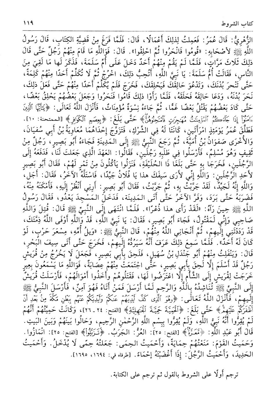 الزُّهْرِىِّ قَالَ عُمَرُ فَعَمِلْتُ لِذَلِكَ أَعْمَالاً. قَالَ فَلَمَّا فَرَغَ مِنْ قَضِيَّةِ الْكِتَابِ قَالَ رَسُولُ اللَّهِ - صلى الله عليه وسلم - لأَصْحَابِهِ «قُومُوا فَانْحَرُوا، ثُمَّ احْلِقُوا». قَالَ فَوَاللَّهِ مَا قَامَ مِنْهُمْ رَجُلٌ حَتَّى قَالَ ذَلِكَ ثَلاَثَ مَرَّاتٍ، فَلَمَّا لَمْ يَقُمْ مِنْهُمْ أَحَدٌ دَخَلَ عَلَى أُمِّ سَلَمَةَ، فَذَكَرَ لَهَا مَا لَقِىَ مِنَ النَّاسِ. فَقَالَتْ أُمُّ سَلَمَةَ يَا نَبِىَّ اللَّهِ، أَتُحِبُّ ذَلِكَ اخْرُجْ ثُمَّ لاَ تُكَلِّمْ أَحَدًا مِنْهُمْ كَلِمَةً حَتَّى تَنْحَرَ بُدْنَكَ، وَتَدْعُوَ حَالِقَكَ فَيَحْلِقَكَ. فَخَرَجَ فَلَمْ يُكَلِّمْ أَحَدًا مِنْهُمْ، حَتَّى فَعَلَ ذَلِكَ نَحَرَ بُدْنَهُ، وَدَعَا حَالِقَهُ فَحَلَقَهُ. فَلَمَّا رَأَوْا ذَلِكَ، قَامُوا فَنَحَرُوا، وَجَعَلَ بَعْضُهُمْ يَحْلِقُ بَعْضًا، حَتَّى كَادَ بَعْضُهُمْ يَقْتُلُ بَعْضًا غَمًّا، ثُمَّ جَاءَهُ نِسْوَةٌ مُؤْمِنَاتٌ فَأَنْزَلَ اللَّهُ تَعَالَى {يَا أَيُّهَا الَّذِينَ آمَنُوا إِذَا جَاءَكُمُ الْمُؤْمِنَاتُ مُهَاجِرَاتٍ فَامْتَحِنُوهُنَّ} حَتَّى بَلَغَ {بِعِصَمِ الْكَوَافِرِ} [الممتحنة: 10] فَطَلَّقَ عُمَرُ يَوْمَئِذٍ امْرَأَتَيْنِ كَانَتَا لَهُ فِى الشِّرْكِ، فَتَزَوَّجَ إِحْدَاهُمَا مُعَاوِيَةُ بْنُ أَبِى سُفْيَانَ، وَالأُخْرَى صَفْوَانُ بْنُ أُمَيَّةَ، ثُمَّ رَجَعَ النَّبِىُّ - صلى الله عليه وسلم - إِلَى الْمَدِينَةِ، فَجَاءَهُ أَبُو بَصِيرٍ - رَجُلٌ مِنْ قُرَيْشٍ - وَهْوَ مُسْلِمٌ فَأَرْسَلُوا فِى طَلَبِهِ رَجُلَيْنِ، فَقَالُوا الْعَهْدَ الَّذِى جَعَلْتَ لَنَا. فَدَفَعَهُ إِلَى الرَّجُلَيْنِ، فَخَرَجَا بِهِ حَتَّى بَلَغَا ذَا الْحُلَيْفَةِ، فَنَزَلُوا يَأْكُلُونَ مِنْ تَمْرٍ لَهُمْ، فَقَالَ أَبُو بَصِيرٍ لأَحَدِ الرَّجُلَيْنِ وَاللَّهِ إِنِّى لأَرَى سَيْفَكَ هَذَا يَا فُلاَنُ جَيِّدًا. فَاسْتَلَّهُ الآخَرُ فَقَالَ أَجَلْ، وَاللَّهِ إِنَّهُ لَجَيِّدٌ، لَقَدْ جَرَّبْتُ بِهِ ثُمَّ جَرَّبْتُ. فَقَالَ أَبُو بَصِيرٍ أَرِنِى أَنْظُرْ إِلَيْهِ، فَأَمْكَنَهُ مِنْهُ، فَضَرَبَهُ حَتَّى بَرَدَ، وَفَرَّ الآخَرُ، حَتَّى أَتَى الْمَدِينَةَ، فَدَخَلَ الْمَسْجِدَ يَعْدُو. فَقَالَ رَسُولُ اللَّهِ - صلى الله عليه وسلم - حِينَ رَآهُ «لَقَدْ رَأَى هَذَا ذُعْرًا». فَلَمَّا انْتَهَى إِلَى النَّبِىِّ - صلى الله عليه وسلم - قَالَ قُتِلَ وَاللَّهِ صَاحِبِى وَإِنِّى لَمَقْتُولٌ، فَجَاءَ أَبُو بَصِيرٍ فَقَالَ يَا نَبِىَّ اللَّهِ، قَدْ وَاللَّهِ أَوْفَى اللَّهُ ذِمَّتَكَ، قَدْ رَدَدْتَنِى إِلَيْهِمْ ثُمَّ أَنْجَانِى اللَّهُ مِنْهُمْ. قَالَ النَّبِىُّ - صلى الله عليه وسلم - «وَيْلُ أُمِّهِ مِسْعَرَ حَرْبٍ، لَوْ كَانَ لَهُ أَحَدٌ». فَلَمَّا سَمِعَ ذَلِكَ عَرَفَ أَنَّهُ سَيَرُدُّهُ إِلَيْهِمْ، فَخَرَجَ حَتَّى أَتَى سِيفَ الْبَحْرِ. قَالَ وَيَنْفَلِتُ مِنْهُمْ أَبُو جَنْدَلِ بْنُ سُهَيْلٍ، فَلَحِقَ بِأَبِى بَصِيرٍ، فَجَعَلَ لاَ يَخْرُجُ مِنْ قُرَيْشٍ رَجُلٌ قَدْ أَسْلَمَ إِلاَّ لَحِقَ بِأَبِى بَصِيرٍ، حَتَّى اجْتَمَعَتْ مِنْهُمْ عِصَابَةٌ، فَوَاللَّهِ مَا يَسْمَعُونَ بِعِيرٍ خَرَجَتْ لِقُرَيْشٍ إِلَى الشَّأْمِ إِلاَّ اعْتَرَضُوا لَهَا، فَقَتَلُوهُمْ، وَأَخَذُوا أَمْوَالَهُمْ، فَأَرْسَلَتْ قُرَيْشٌ إِلَى النَّبِىِّ - صلى الله عليه وسلم - تُنَاشِدُهُ بِاللَّهِ وَالرَّحِمِ لَمَّا أَرْسَلَ، فَمَنْ أَتَاهُ فَهْوَ آمِنٌ، فَأَرْسَلَ النَّبِىُّ - صلى الله عليه وسلم - إِلَيْهِمْ، فَأَنْزَلَ اللَّهُ تَعَالَى {وَهُوَ الَّذِي كَفَّ أَيْدِيَهُمْ عَنْكُمْ وَأَيْدِيَكُمْ عَنْهُمْ بِبَطْنِ مَكَّةَ مِنْ بَعْدِ أَنْ أَظْفَرَكُمْ عَلَيْهِمْ} حَتَّى بَلَغَ {الْحَمِيَّةَ حَمِيَّةَ الْجَاهِ