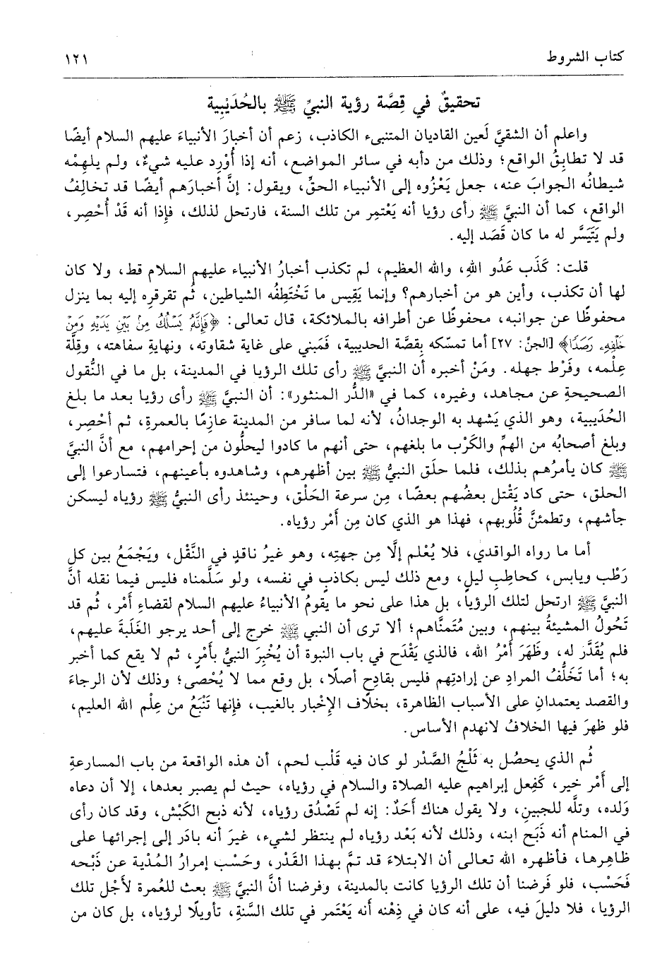 أما ما رواه الواقدي، فلا يُعْلم إلا مِن جهتِه، وهو غيرُ ناقدٍ في النَّقْل، ويَجْمَعُ بين كل رَطْب ويابس، كحاطِبِ ليلٍ، ومع ذلك ليس بكاذبٍ في نفسه، ولو سَلَّمناه فليس فيما نقله أنَّ النبيِّ صلى الله عليه وسلّم ارتحل لتلك الرؤيا، بل هذا ما نحو ما يقومُ الأنبياءُ عليهم السلام لقضاءِ أَمْر، ثُم قد تَحُولُ المشيئةُ بينهم، وبين مُتَمنَّاهم؛ ألا ترى أن النبي صلى الله عليه وسلّم خرج إلى أحد يرجو الغَلَبةَ عليهم، فلم يُقَدَّر له، وظَهَرَ أَمْرُ الله، فالذي يَقْدَح في باب النبوة أن يُخْبِرَ النبيُّ بأَمْرٍ، ثم لا يقع كما أخبر به؛ أما تَخَلُّفُ المرادِ عن إرادتِهم فليس بقادِحٍ أصلا، بل وقع مما لا يُحْصى؛ وذلك لأن الرجاءَ والقصد يعتمدانِ على الأسباب الظاهرة، بخلاف الإِخْبار بالغيب، فإِنها تَنْبَعُ من عِلْم الله العليم، فلو ظهرَ فيها الخلافُ لا نهدم الأساس.