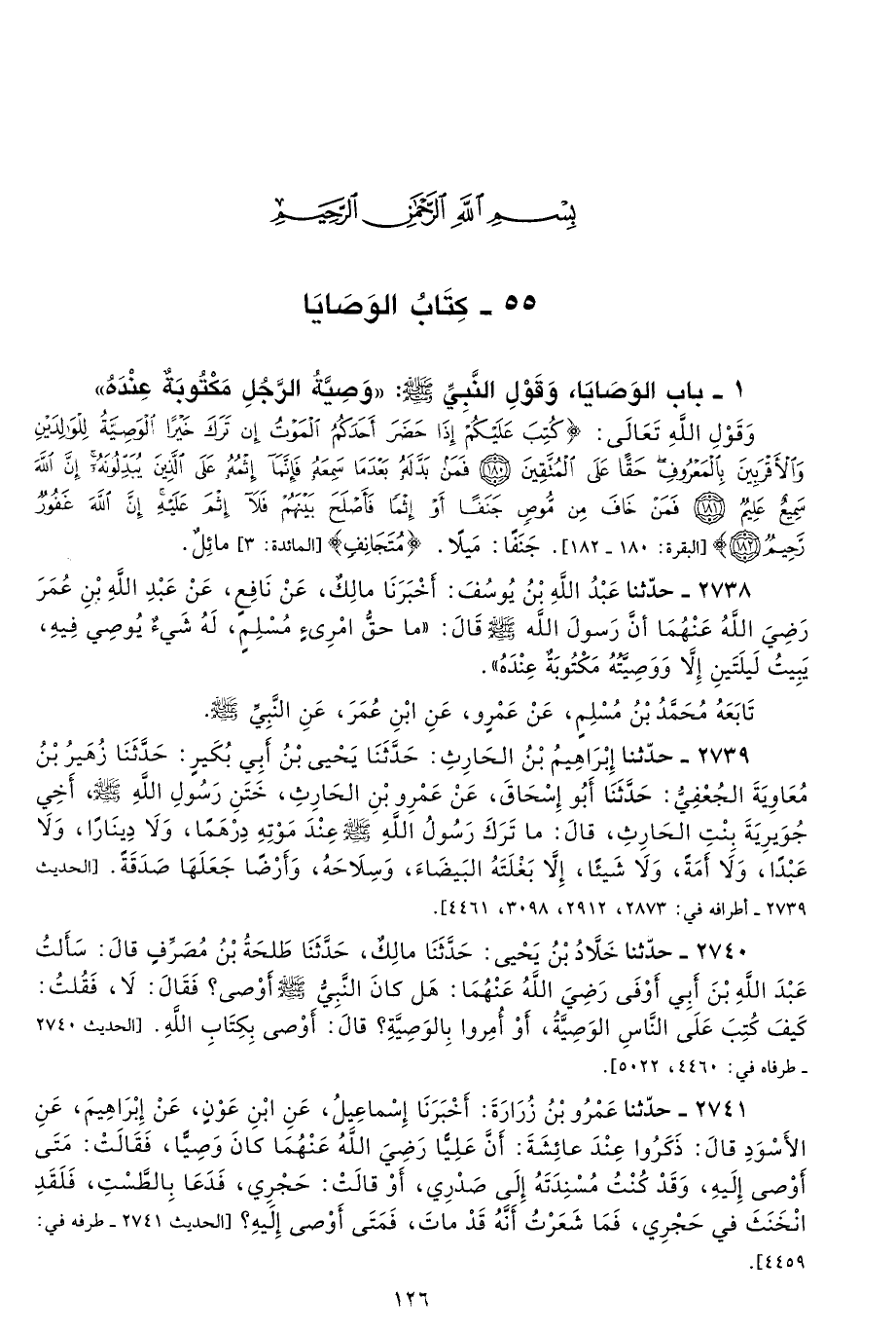 2740 - حَدَّثَنَا خَلاَّدُ بْنُ يَحْيَى حَدَّثَنَا مَالِكٌ حَدَّثَنَا طَلْحَةُ بْنُ مُصَرِّفٍ قَالَ سَأَلْتُ عَبْدَ اللَّهِ بْنَ أَبِى أَوْفَى - رضى الله عنهما - هَلْ كَانَ النَّبِىُّ - صلى الله عليه وسلم - أَوْصَى فَقَالَ لاَ. فَقُلْتُ كَيْفَ كُتِبَ عَلَى النَّاسِ الْوَصِيَّةُ أَوْ أُمِرُوا بِالْوَصِيَّةِ قَالَ أَوْصَى بِكِتَابِ اللَّهِ. طرفاه 4460، 5022 - تحفة 5170