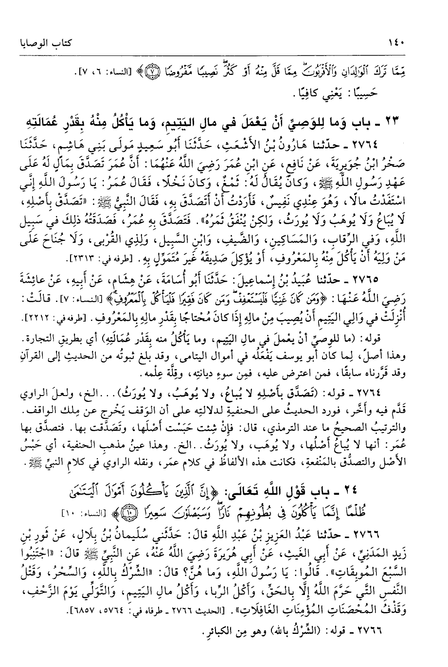 2765 - حَدَّثَنَا عُبَيْدُ بْنُ إِسْمَاعِيلَ حَدَّثَنَا أَبُو أُسَامَةَ عَنْ هِشَامٍ عَنْ أَبِيهِ عَنْ عَائِشَةَ - رضى الله عنها - {وَمَنْ كَانَ غَنِيًّا فَلْيَسْتَعْفِفْ وَمَنْ كَانَ فَقِيرًا فَلْيَأْكُلْ بِالْمَعْرُوفِ} [النساء: 6]. قَالَتْ أُنْزِلَتْ فِى وَالِى الْيَتِيمِ أَنْ يُصِيبَ مِنْ مَالِهِ إِذَا كَانَ مُحْتَاجًا بِقَدْرِ مَالِهِ بِالْمَعْرُوفِ. طرفاه 2212، 4575 - تحفة 16814