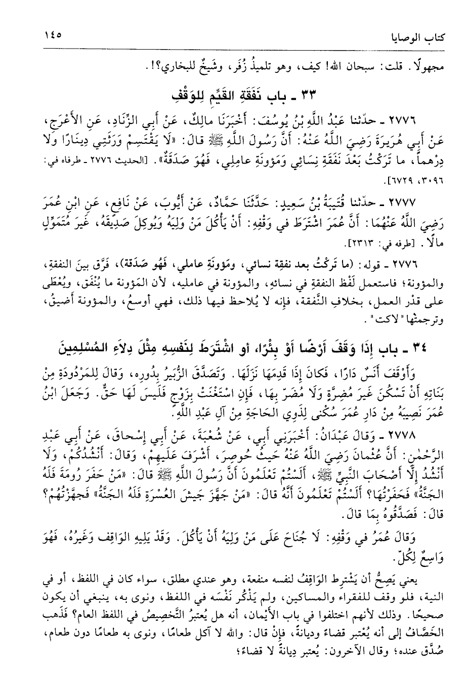 2777 - حَدَّثَنَا قُتَيْبَةُ بْنُ سَعِيدٍ حَدَّثَنَا حَمَّادٌ عَنْ أَيُّوبَ عَنْ نَافِعٍ عَنِ ابْنِ عُمَرَ - رضى الله عنهما - أَنَّ عُمَرَ اشْتَرَطَ فِى وَقْفِهِ أَنْ يَأْكُلَ مَنْ وَلِيَهُ وَيُوكِلَ صَدِيقَهُ غَيْرَ مُتَمَوِّلٍ مَالاً. أطرافه 2313، 2737، 2764، 2772، 2773 - تحفة 10561، 7561