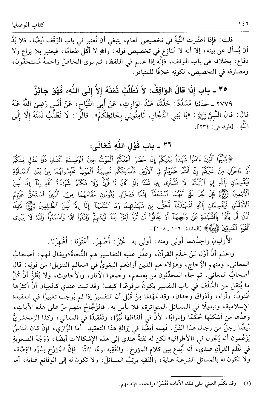 قلت: فإِذا اعتُبرت النِّيةُ في تخصيص العام، ينبغي أن تُعتبر في باب الوَقْف أيضًا، فلا بُدَّ أن يُسأل عن نِيئه، إلا أنه لا مُنازِع في تخصيص قوله: واللهِ لا آكُل طعامًا، فيعتبر بلا نِزاع ولا دفاع، بخلافه في باب الوقف، فإِنَّه إذا عَمَّ في اللفظ، ثم نوى الخاصَّ زاحمهُ مُستحقّون، ومصارفه في التخصيص، لكونِه خلافًا للمتبادر.