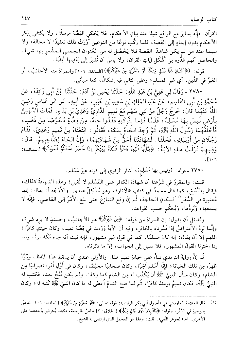 (¬1) قال العلامة المارديني في "أصول أبي بكر الرازي": قوله تعالى: {أَوْ آخَرَانِ مِنْ غَيْرِكُمْ} [المائدة: 106] خاص بالوصيةِ في السَّفَر، وقوله: {وَأَشْهِدُوا ذَوَيْ عَدْلٍ مِنْكُمْ} [الطلاق: 2] خاصٌ بالرجعة، فكيف يُعترض بأحدهما على الأخرى. اهـ "الجوهر النَّقي"، قلت: وهذا هو المحمل الذي ارتضى به الشيخ.