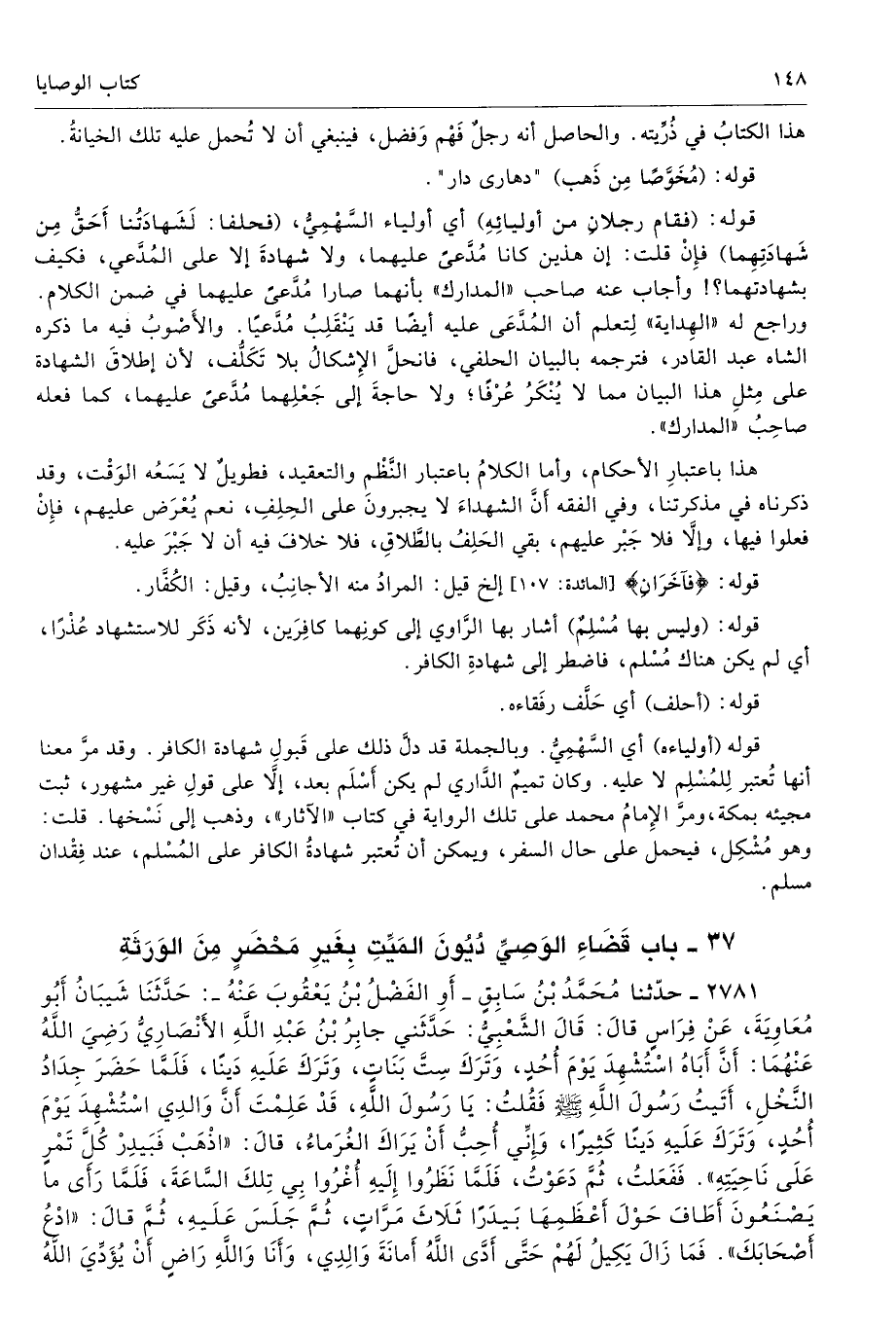 قوله (أولياءه) أي السَّهْمِيُّ. وبالجملة قد دلَّ على قَبولِ شهادة الكافر. وقد مرَّ معنا أنها تُعتبر لِلمُسْلِم لا عليه. وكان تميمٌ الدَّاري لم يكن أَسْلَم بعد، إلا على قولِ غير مشهور، ثبت مجيئه بمكة، ومرَّ الإِمامُ محمد على تلك الرواية في كتاب «الآثار»، وذهب إلى نَسْخها. قلت: وهو مُشْكِل، فيحمل على حال الصفر، ويمكن أن تُعتبر شهادةُ الكافر على المُسْلم، عند فِقْدان مسلم.