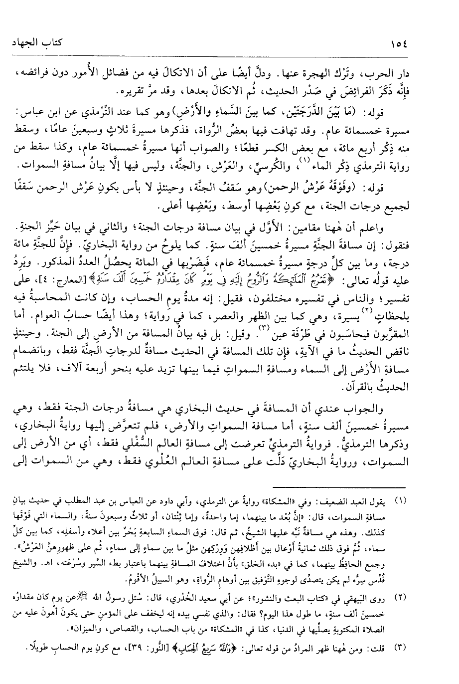 والجواب عندي أن المسافةَ في حديث البخاري هي مسافةٌ درجات الجنة فقط، وهي مسيرةُ خمسينَ ألف سنةٍ، وأما مسافة السمواتِ والأرض، فلم تتعرَّض إليها روايةُ البخاري، وذكرها الترمذيُّ. فروايةُ الترمذيِّ تعرضت إلى مسافةِ العالم السُّفْلي فقط، أي من الأرض إلى السموات، وروايةُ البخاريّ دَلَّت على مسافةِ العالم العُلْوي فقط، وهي من السموات إلى